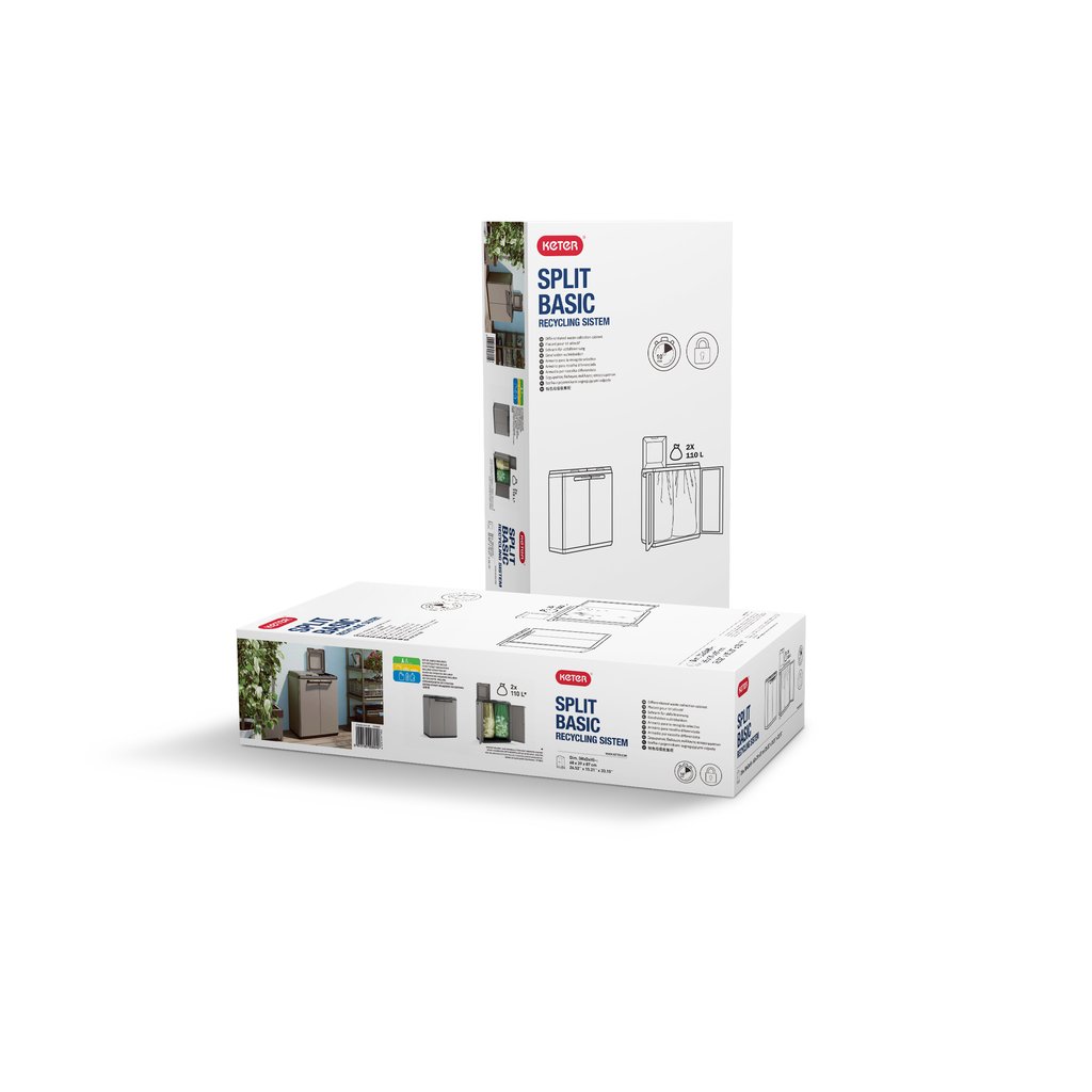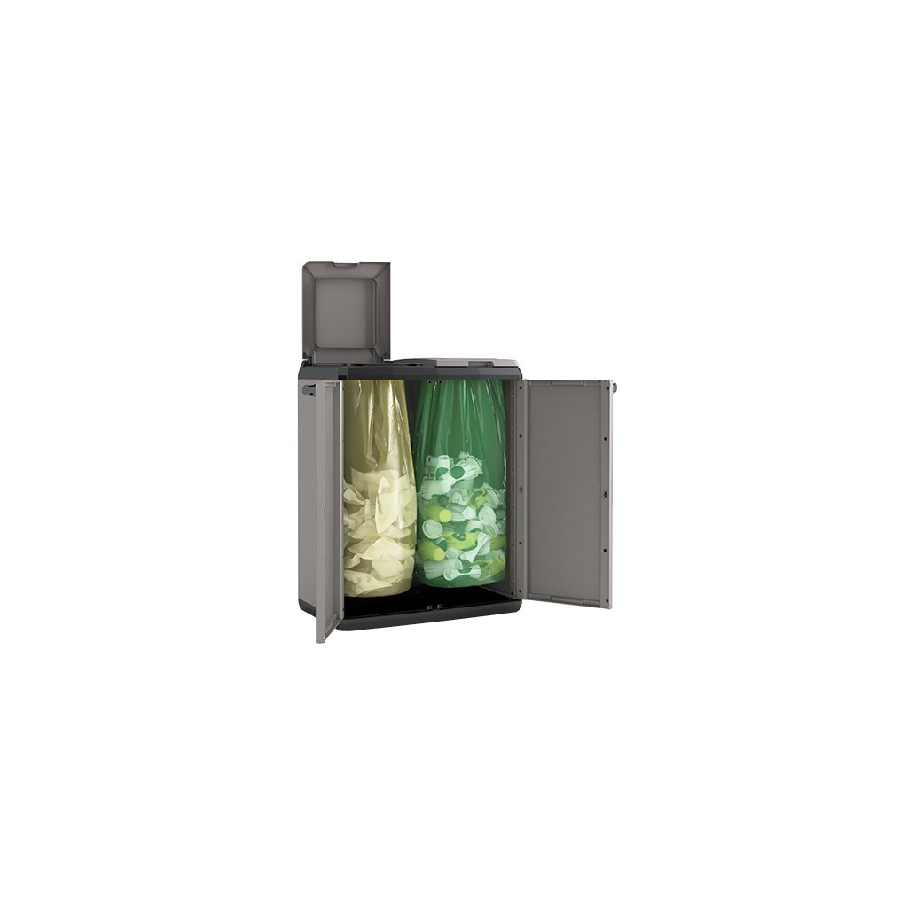 Praktikus újrahasznosító edény két zsákhoz SPLIT CABINE BASIC hulladékválogatáshoz, felső nyílással a hulladék bedobásához. A bejárati ajtónak köszönhetően könnyen hozzáférhet a szemeteszsákokhoz. Értékelni fogja az egyszerű karbantartást és a praktikus kialakítást.