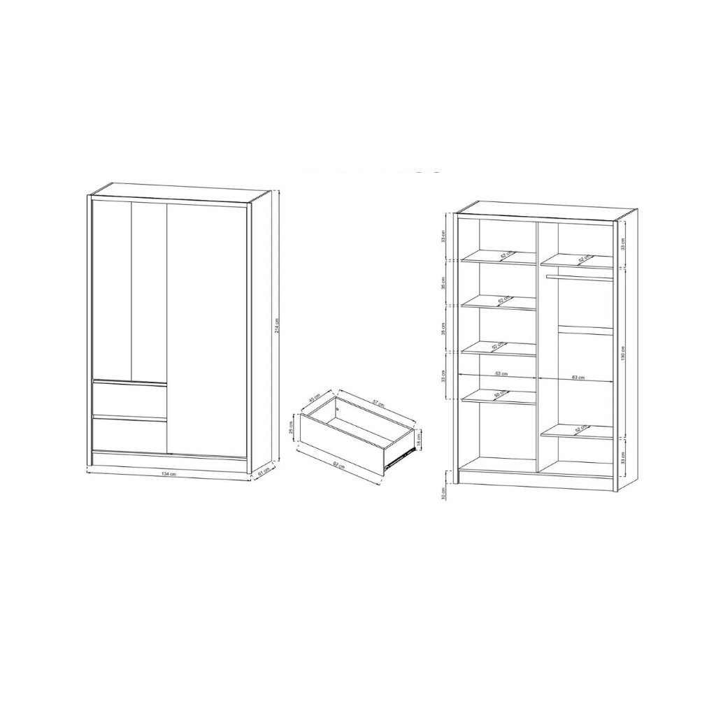 Az RHEA gardróbszekrény a népszerű fehér és tölgyfa színekben kapható, így könnyedén kombinálható bármilyen enteriőrrel. Az RHEA gardróbszekrény laminált forgácslapból készült. A modern RHEA gardróbszekrény tolóajtókkal és tükörrel rendelkezik. A gardróbszekrény rengeteg tárolóhelyet kínál, ruhaakasztó rúddal, praktikus polcokkal és fiókokkal rendelkezik.