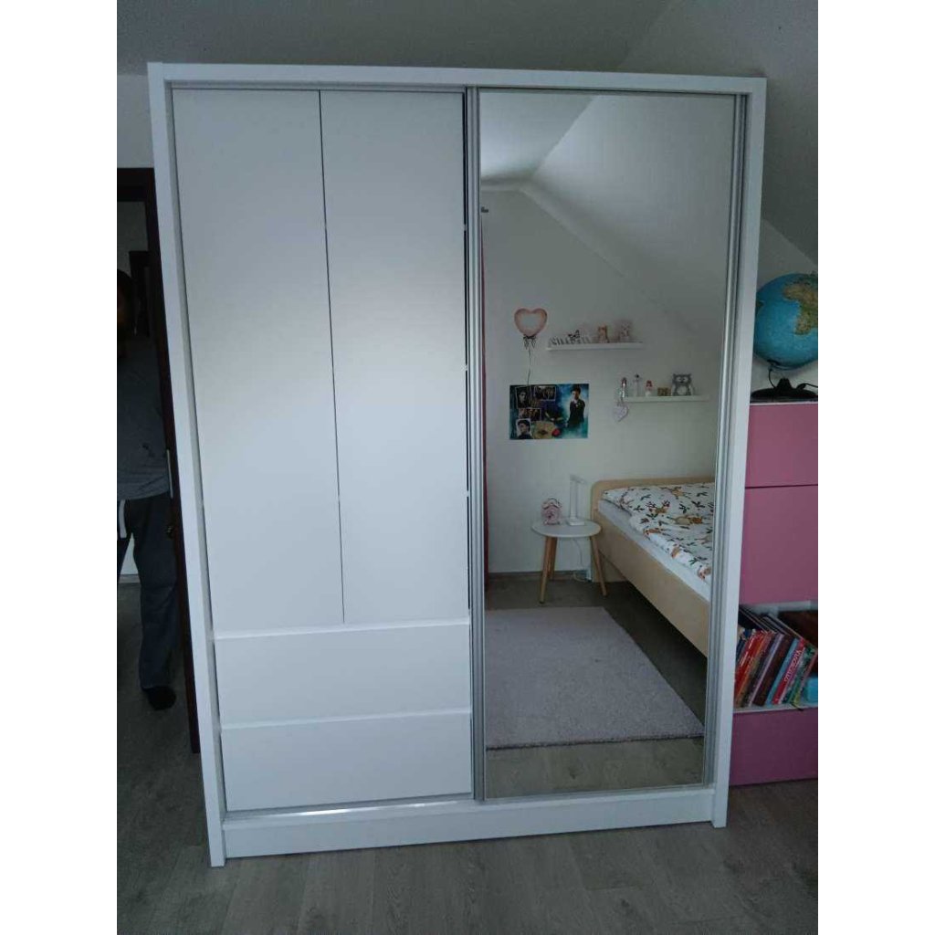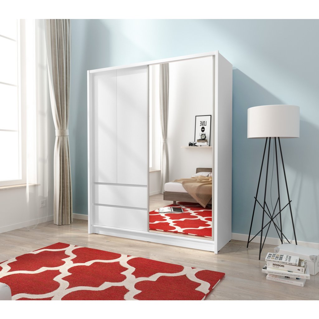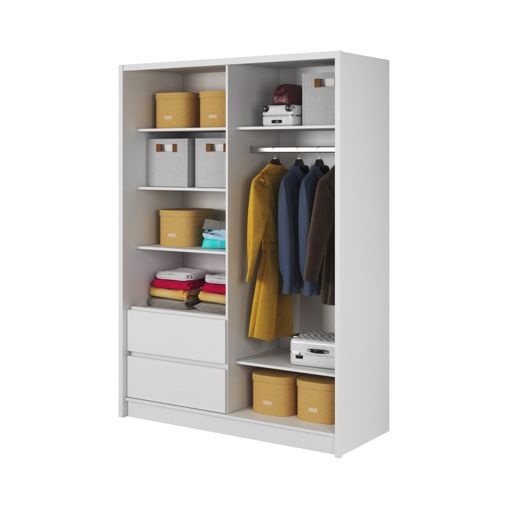 A tolóajtós gardróbszekrény ideális megoldás mindazok számára, akik stílusos és praktikus bútorokat keresnek otthonukba. A tolóajtók helyet takarítanak meg és modern megjelenést kölcsönöznek, a tükör optikailag megnöveli a teret , a fiókok pedig további tárolóhelyet biztosítanak a jobb rendszerezés érdekében. Az RHEA gardróbszekrény laminált forgácslapból készült. A modern RHEA gardróbszekrény tolóajtókkal és tükörrel rendelkezik. A gardróbszekrény rengeteg tárolóhelyet kínál, ruhaakasztó rúddal, praktikus polcokkal és fiókokkal rendelkezik.
