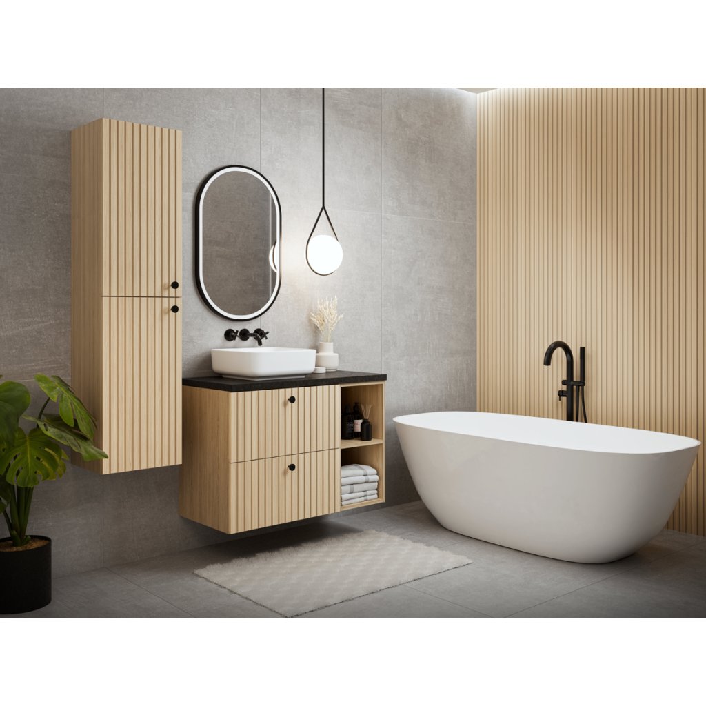 A RIETTI TÖLGY VICENZA D50 mosdószekrény | 50 cm ötvözi a tartós anyagokat, a modern dizájnt és a praktikus részleteket . A fekete fém fogantyúk hangsúlyozzák az ipari stílust és kényelmes használatot biztosítanak . A szekrény kiváló minőségű LTD és fóliával bevont MDF lapból készült, ami hosszú élettartamot és egyszerű karbantartást garantál. A fiókok önzáró rendszerrel és csendes kivitelben vannak felszerelve, ami kényelmet biztosít a mindennapi használat során. A szekrény elegáns és időtlen kialakítása bármilyen modern fürdőszobába illik. A szekrény két tágas fiókkal rendelkezik, az ár nem tartalmazza a mosdót és a csaptelepet.