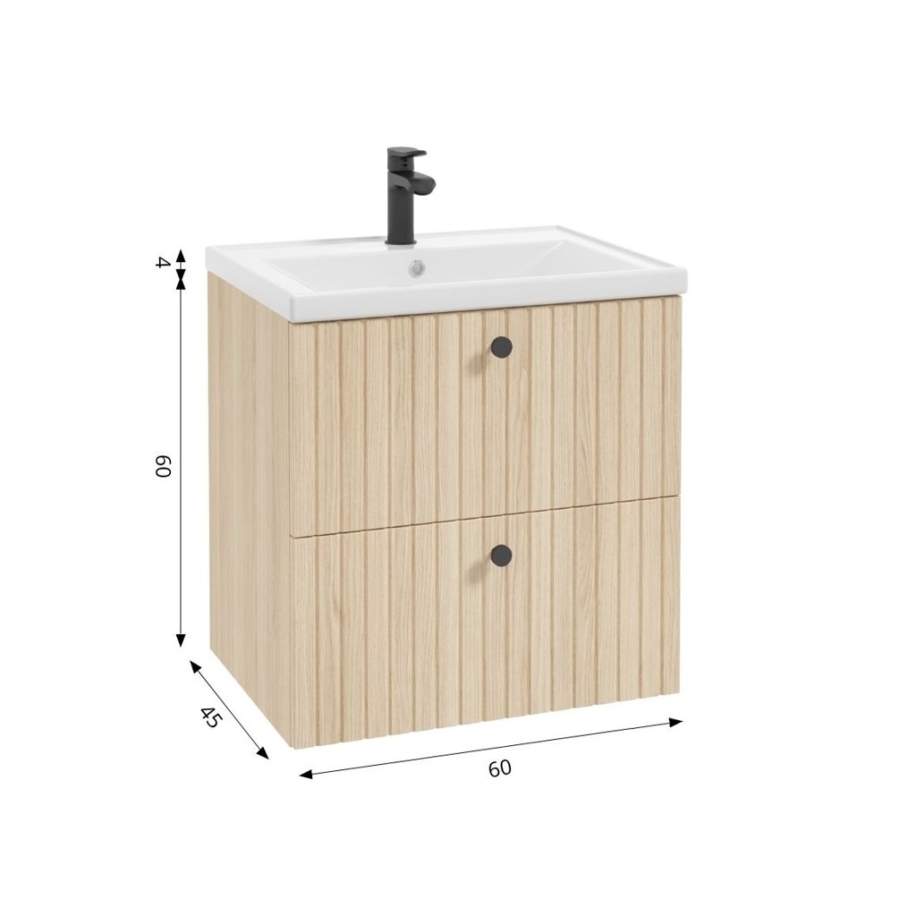 A RIETTI TÖLGY VICENZA D60 mosdószekrény | 60 cm ötvözi a tartós anyagokat, a modern dizájnt és a praktikus részleteket . A fekete fém fogantyúk hangsúlyozzák az ipari stílust és kényelmes használatot biztosítanak . A szekrény kiváló minőségű LTD és fóliával bevont MDF lapból készült, ami hosszú élettartamot és egyszerű karbantartást garantál. A fiókok önzáró rendszerrel és csendes kivitelben vannak felszerelve, ami kényelmet biztosít a mindennapi használat során. A szekrény elegáns és időtlen kialakítása bármilyen modern fürdőszobába illik. A szekrény két tágas fiókkal rendelkezik, az ár nem tartalmazza a mosdót és a csaptelepet.