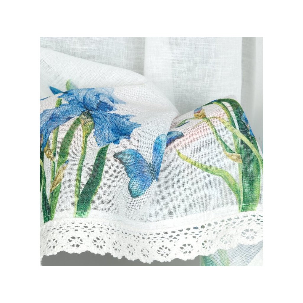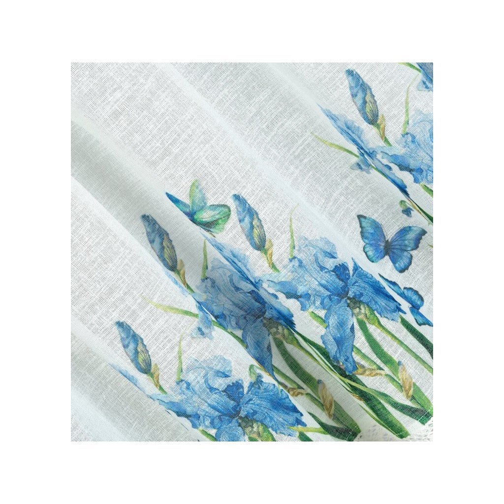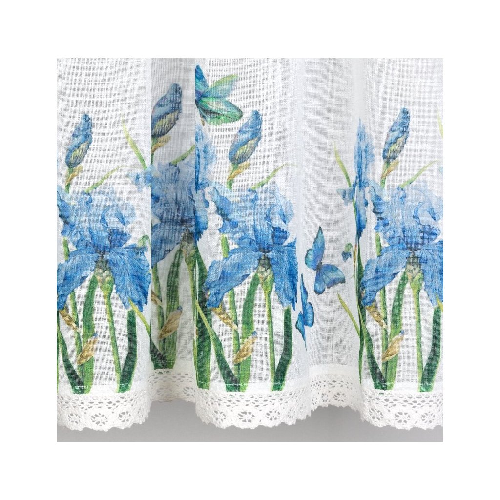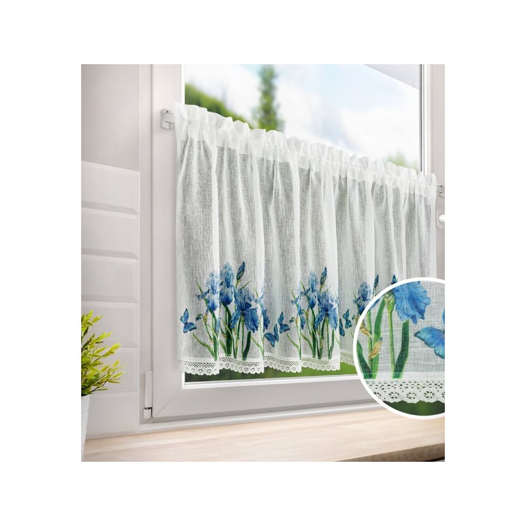 Fehér függöny ALA egy kék virágmintás rövid függöny a konyhaablakhoz, alsó szélén csipke van. A rojtos szalagnak köszönhetően lágy hullámokká van összehajtva. Kiváló minőségű 100% poliészterből készült. Ne habozzon, válasszon a menüből kész függönyök.