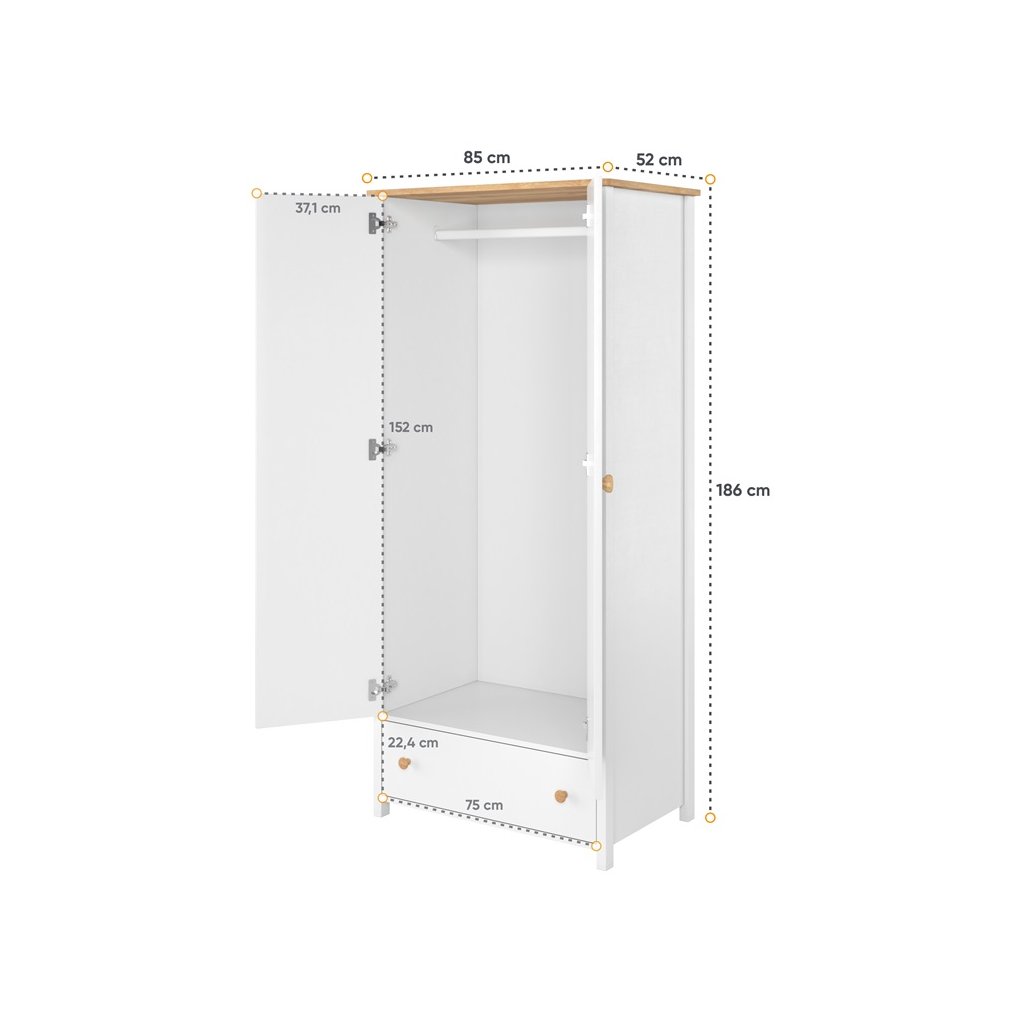 A LORRY gyerek szekcionált bútorok ideális választást jelentenek mindenkinek. Romantikus hangulatot árasztó gyerekszobákba . A LORRY gyerek szekcióbútor-garnitúra lágy színekben és formákban készült, így lányoknak és fiúknak egyaránt alkalmas. A gyerek szekcióbútorok jellegzetes vonása az elegáns matt fehér színkialakítás , amelyet ízlésesen kiegészít a Nash tölgy világosbarna színe. A LORRY gyerekbútor-kollekció számos egyedi elemből is áll, amelyek nagyon könnyen kombinálhatók, így teret biztosítva a kreatív és változatos elhelyezésnek. A LORRY gardróbszekrény kétajtós, alsó részében fiókkal.