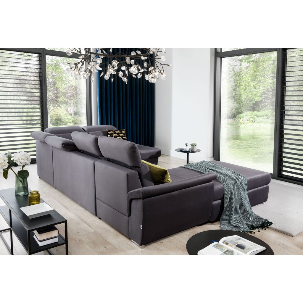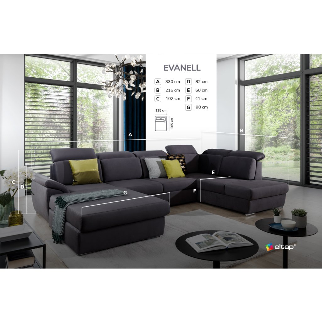 A tágas és kényelmes, U alakú sarokkanapé, az EVANELL, feltűnő kiegészítője a modern nappalinak. Az EVANELL egy kényelmes , U alakú kanapé . Könnyen kihajtható. Kibontás után egy tágas, 125 x 265 cm-es hálórészt kap , amely még a legigényesebb felhasználók igényeit is kielégíti. Az EVANELL kanapé kiváló minőségű... rugók és rugalmas hab. A kanapégarnitúra funkcionalitását a kellően nagy tárolóhely is fokozza.