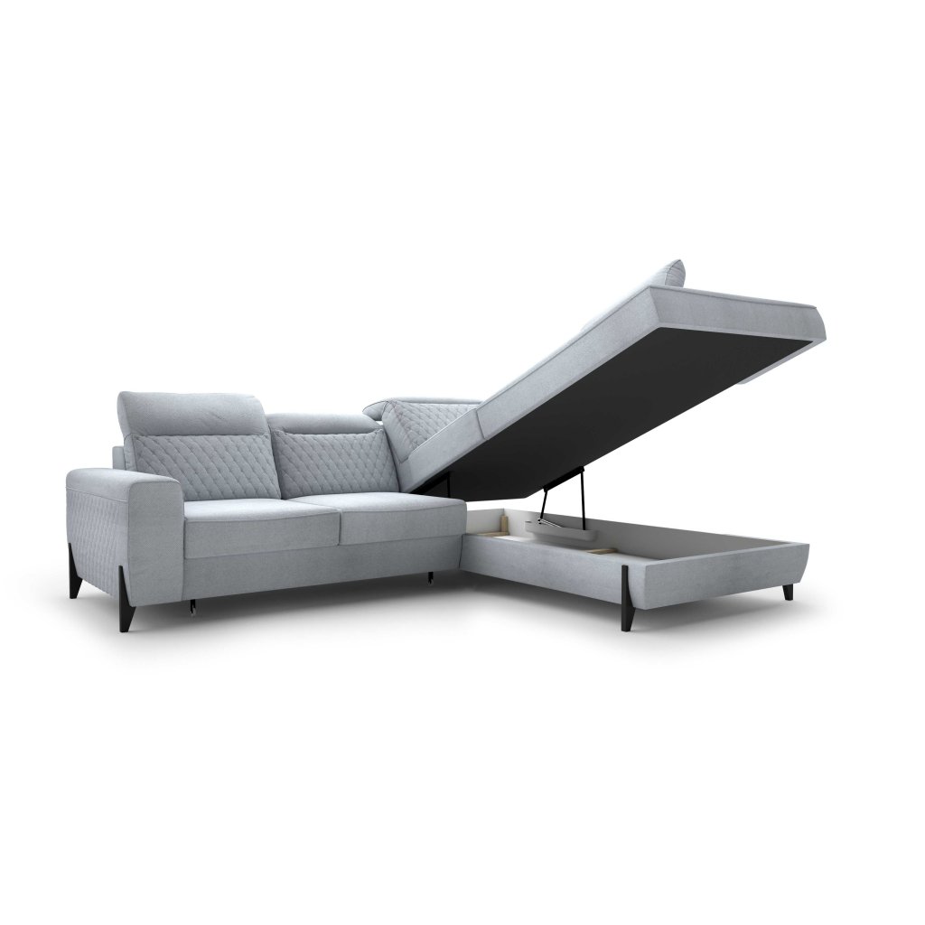 A kanapé váza puha és kemény fából - forgácslapból - készült. A kanapé ülőlapja fali rugókkal van felszerelve az optimális rugalmasság érdekében. Az ülőlap és a háttámla kárpitozásához kiváló minőségű PUR hab használt . A sarokkanapé fém lábai jellegzetes eleganciát kölcsönöznek a helyiségnek. Az ülőlap impregnálható , vagy szükség esetén univerzális tisztítószerrel tisztítható .