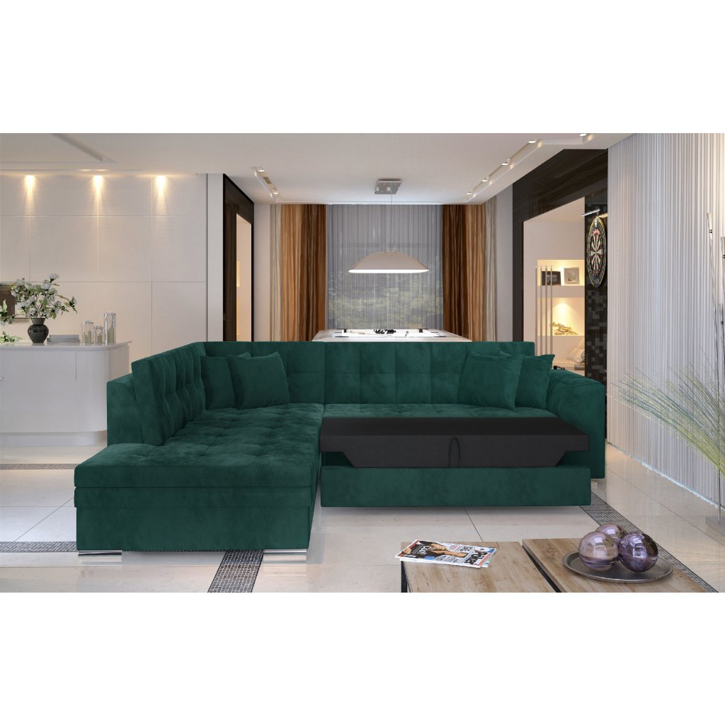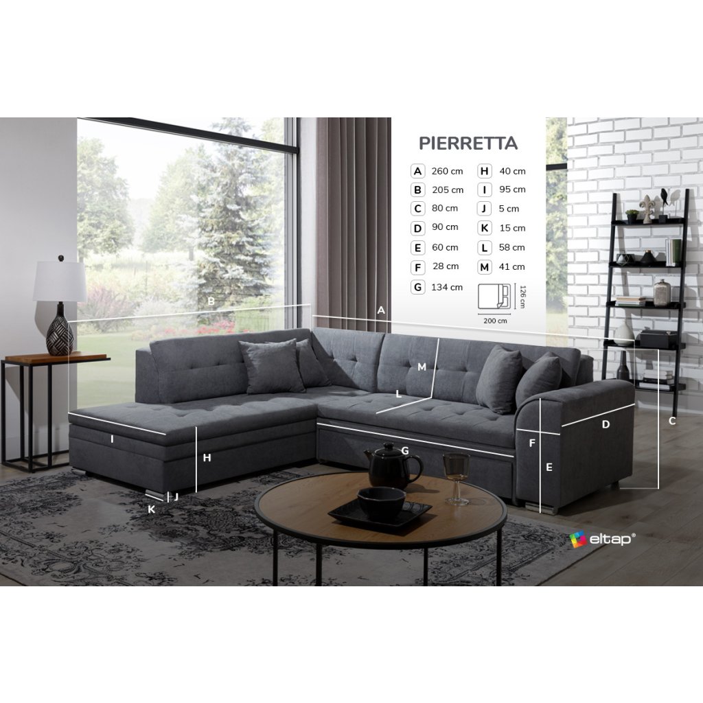 A PIERETTA sarokkanapé-garnitúrát egyszerű dizájn jellemzi, ezért modern belső terekbe illik. Az ülőfelület és a háttámla elegáns varrással van díszítve. A kanapégarnitúra krómozott acélból készült fém lábakkal rendelkezik. A kényelmes pihenést a masszív szerkezet, valamint a felhasznált anyagok és töltetek biztosítják. A kanapégarnitúra egy 200 x 126 cm- es hálórésszel rendelkező kihúzható kanapéágy . A háttámlája is kárpitozott, így a térkihasználás is megfelelő.