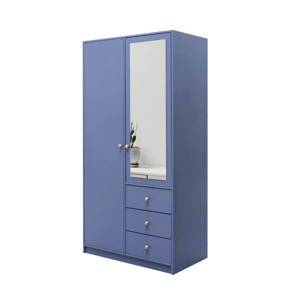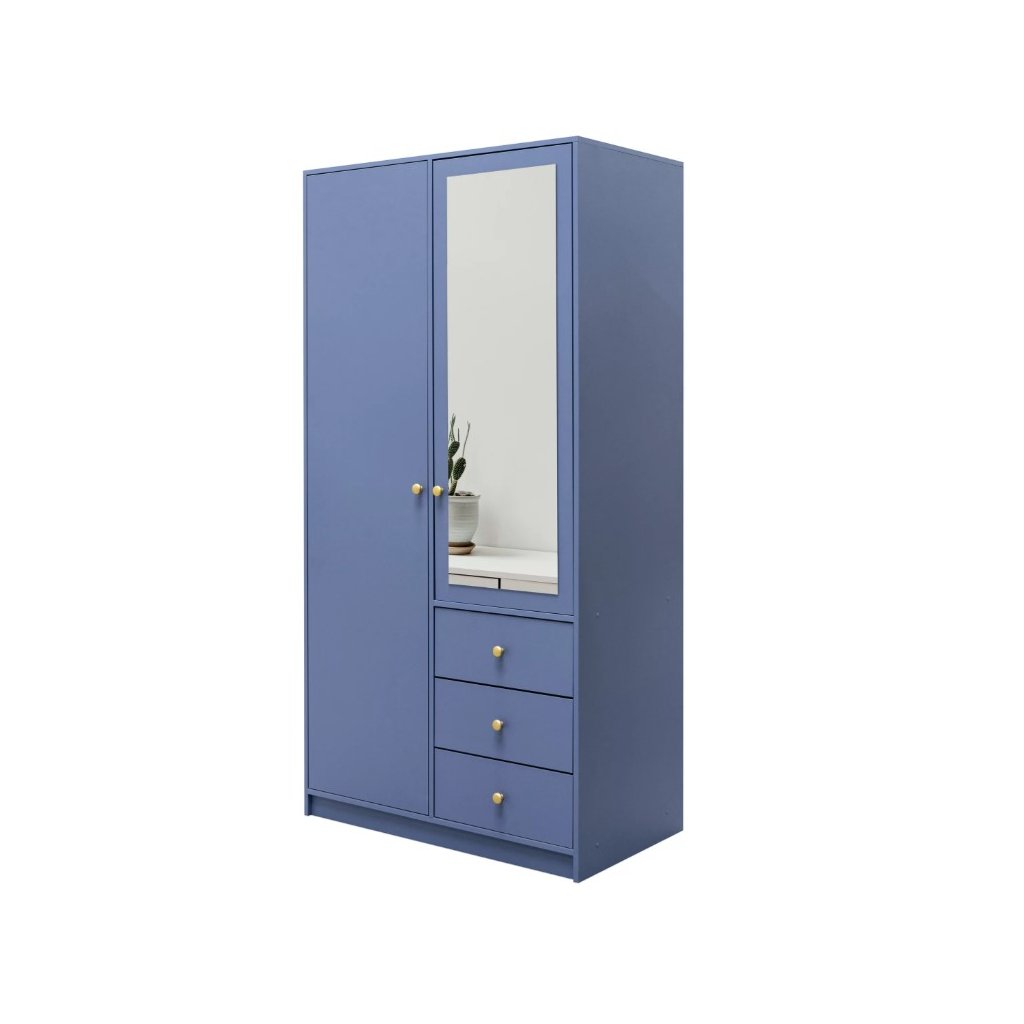 A SIENA színkollekció a modern stílus és a minimalizmus ötvözésével jött létre. A SIENA gardrób kék színű, két ajtós és három tágas fiókos. A gardrób tükörrel is rendelkezik. Színének köszönhetően kiemelkedik a belső térben, a tükör optikailag megnöveli a szobát.