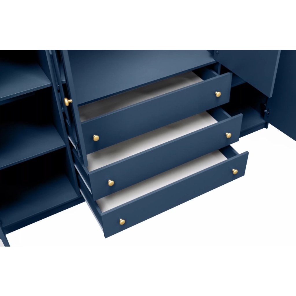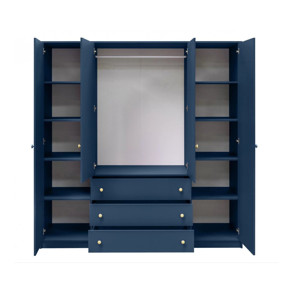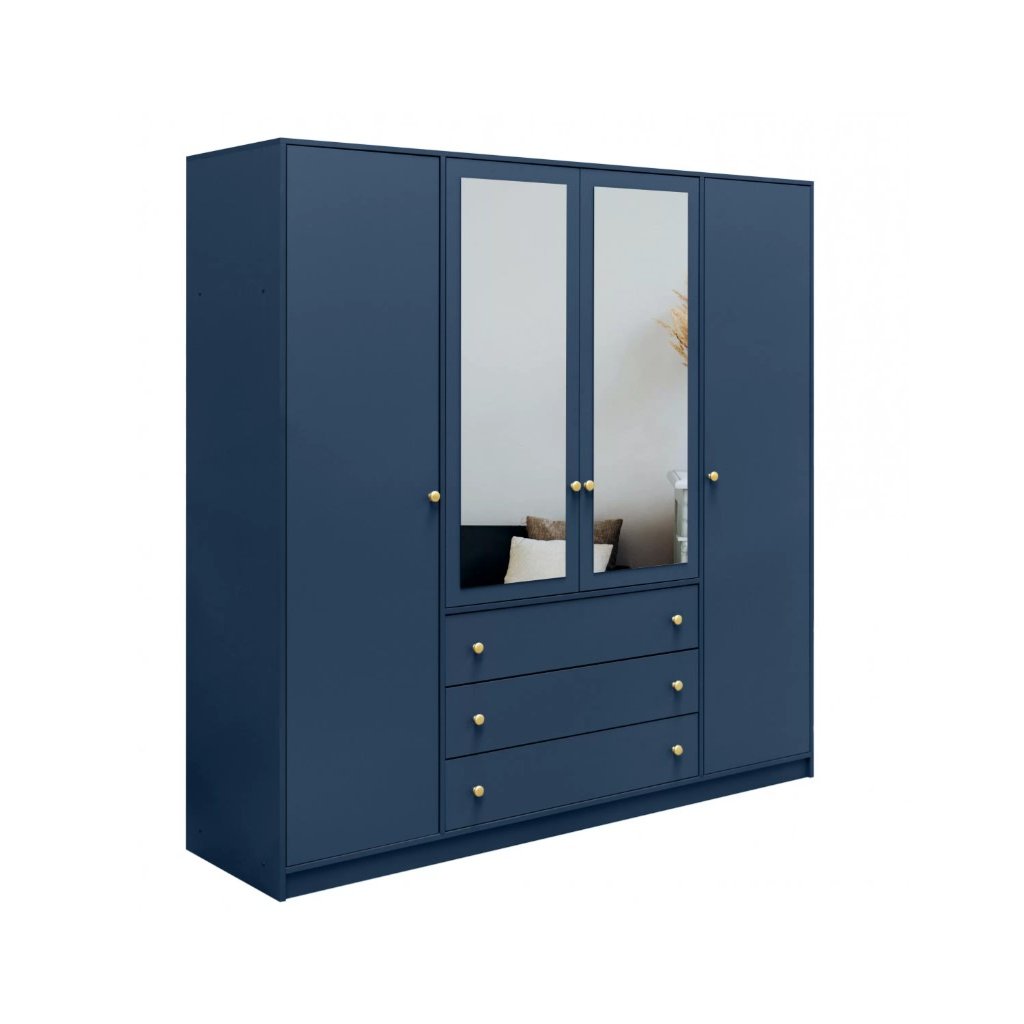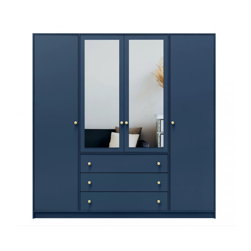 A SIENA színkollekció a modern stílus és a minimalizmus ötvözésével jött létre. SIENA gardrób A 2 D4 sötétkék színű, négy ajtóval és három tágas fiókkal rendelkezik. A szekrény tükörrel is rendelkezik. Kiemelkedő lesz a belső térben. színének köszönhetően, A tükör optikailag megnöveli a szobát.