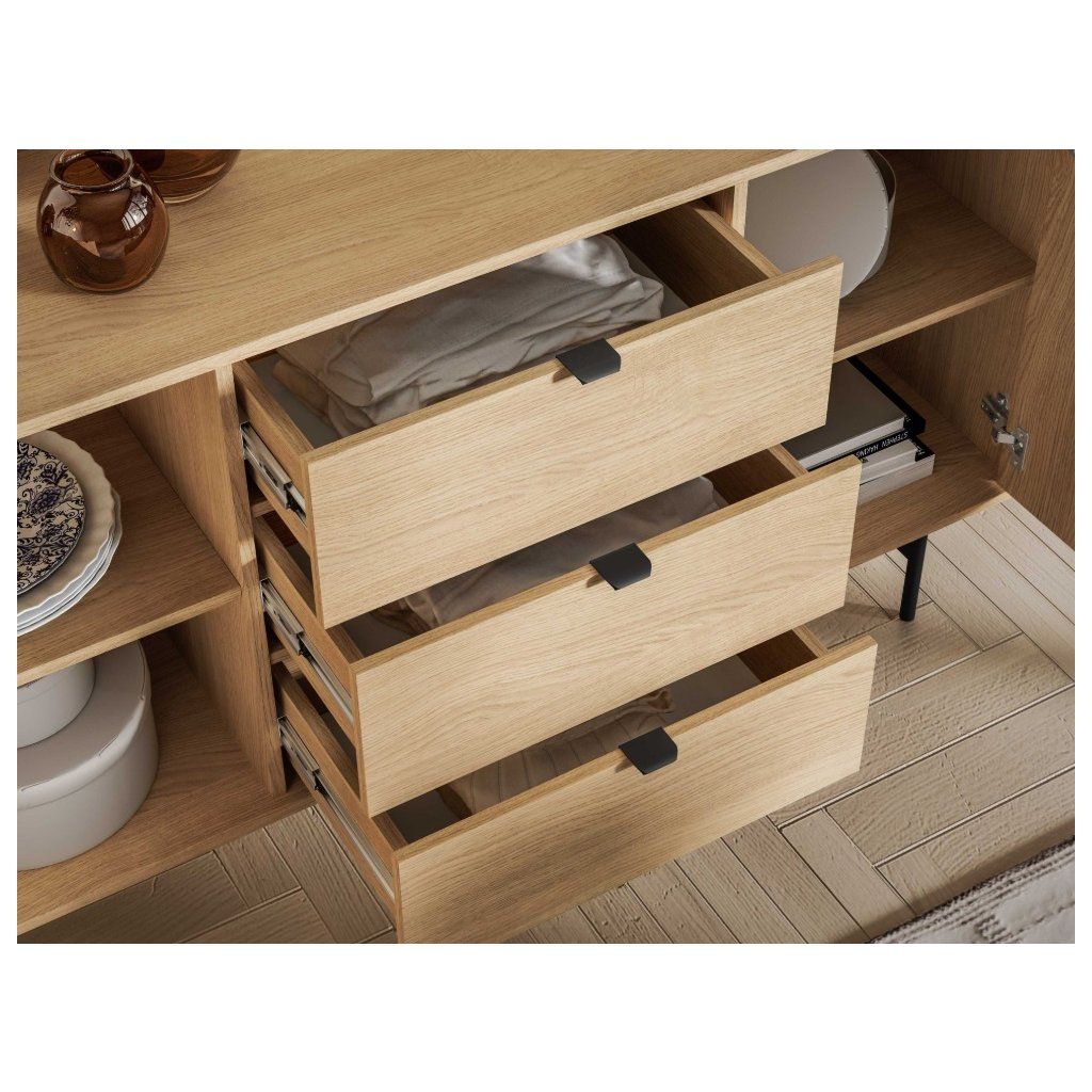 A SORENY 05 komód modern belső terekbe készült, ötvözve az elegáns dizájnt , az egyszerűséget és a funkcionalitást. A Mavelie Natural tölgyfa dekor természetes és meleg megjelenést kölcsönöz a térnek, míg a minimalista forma időtlen karaktert kölcsönöz a bútornak. A bútor könnyű fém szerkezetre épül, ami légies és modern megjelenést kölcsönöz neki . A bútorok praktikumát olyan funkcionális megoldások fokozzák, mint a teljes kihúzású fiókok, a nyomásra nyíló rendszer és a lágyan záródó zsanérok , amelyek kényelmes és csendes használatot biztosítanak. A komód nappaliba és hálószobába egyaránt alkalmas, így egységes és harmonikus belső teret alakíthat ki az egész lakásban.