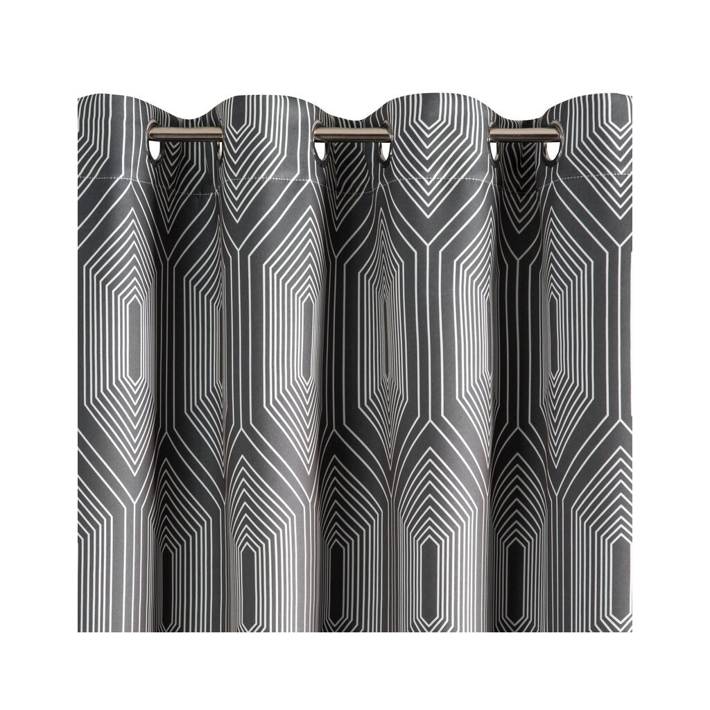 Modern sötétítő textilfüggöny nagy belső sötétséggel, kontrasztos geometriai nyomattal díszítve. Könnyen vasalható. Szélesség: 140 cm, hossz: 250 cm, szín: grafit, súly: 210 GSM, összetétel: Anyaga: 100% poliészter