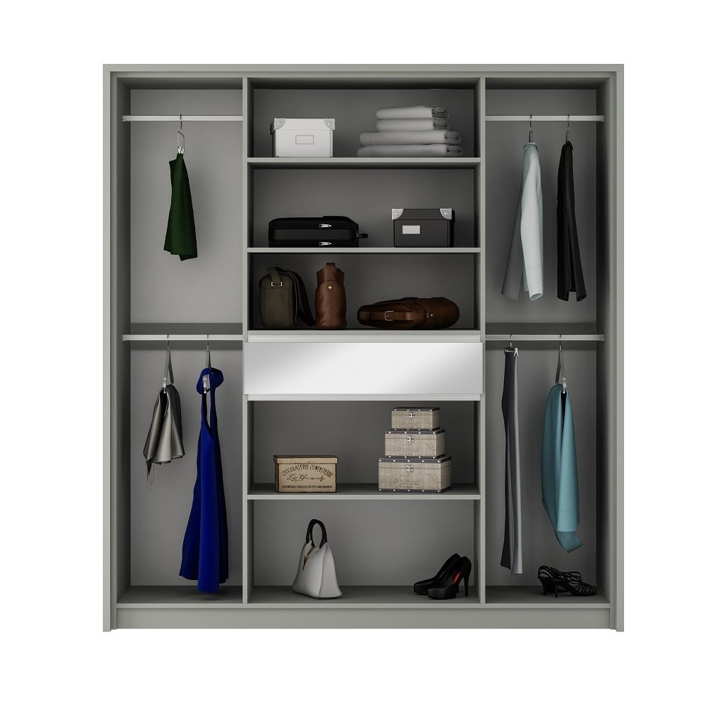 A SPLIT 200 gardrób modern szettakkal és időtlen megjelenéssel készült. A gardrób rengeteg tárolóhelyet és ellenállhatatlan dizájnt kínál. A gardrób belső szerelvényeket is tartalmaz. A bútorokat szétszerelt állapotban szállítjuk. A platina-szürke színvilág eleganciát és ízlést kölcsönöz a gardróbnak.