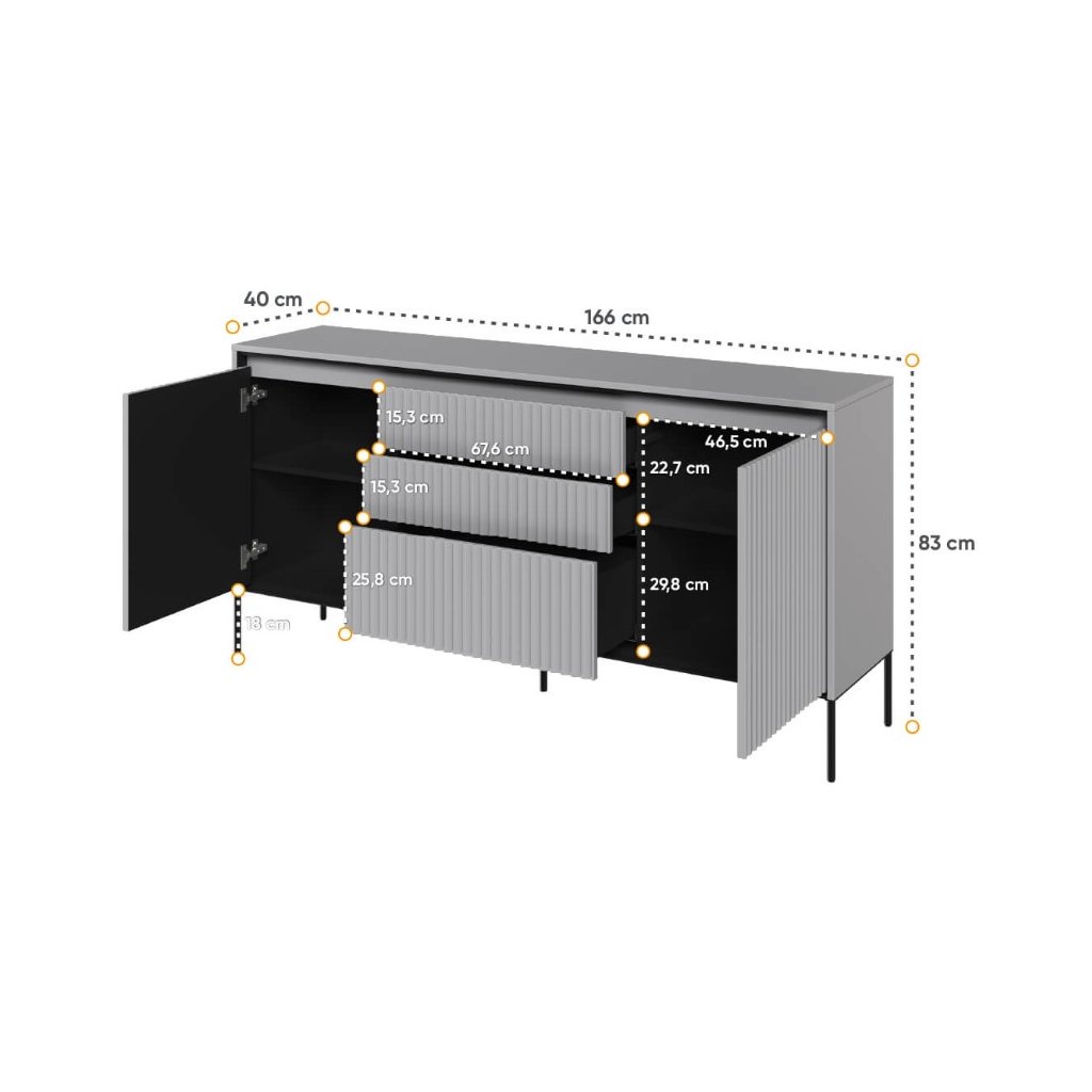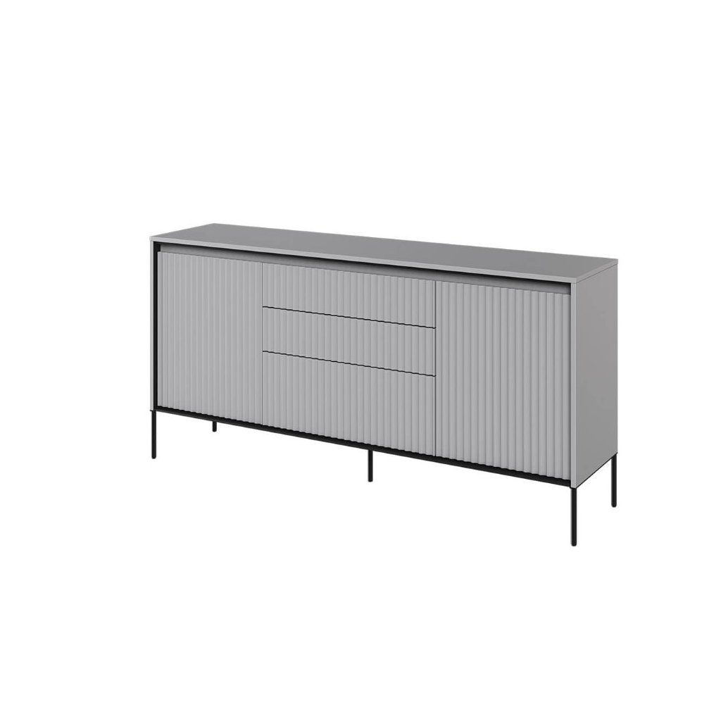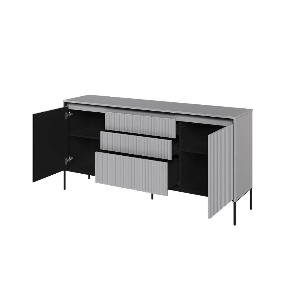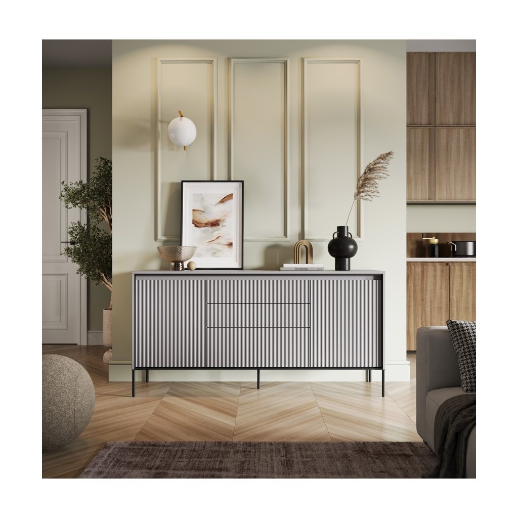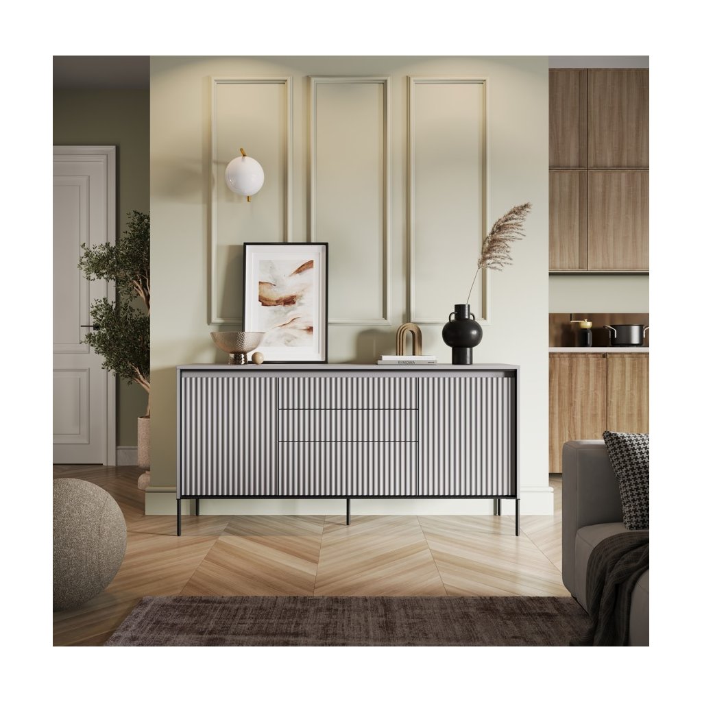 A luxus SWING TR-01 komód modern szürke színben , kiváló minőségű anyagokból készült. A fiókos szekrény NYOMÁSRA NYITÓ rendszerrel rendelkezik , amely lehetővé teszi a könnyű és kényelmes nyitást és zárást fogantyúk nélkül. A léces ajtódizájn egy újabb esztétikai elem, amely jellegzetes bájt és stílust kölcsönöz a helyiségnek. Az elegáns fekete fém lábak könnyedséget kölcsönöznek az összképnek, növelik a stabilitást és a tartósságot. A komód ára tartalmazza a LED világítást. A komód szétszerelt állapotban kerül kiszállításra.