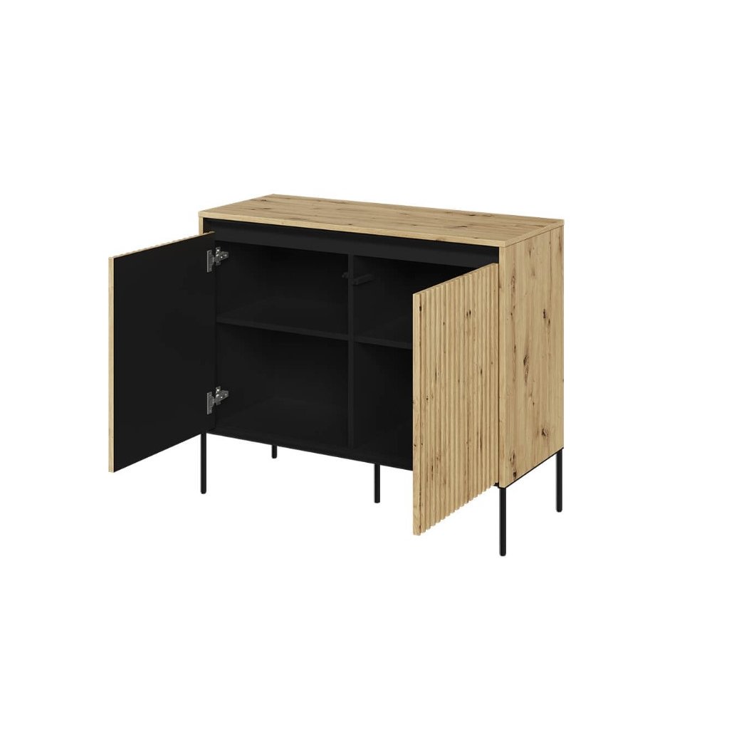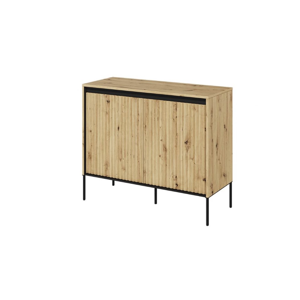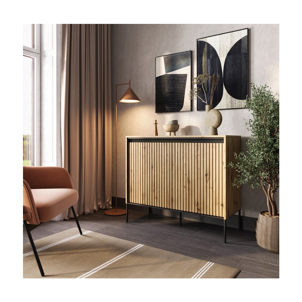 A stílusos SWING TR-02 fiókos szekrény modern, kézműves tölgy színben , kiváló minőségű anyagokból készült. A fiókos szekrény NYOMÁSRA NYITÓ rendszerrel rendelkezik , amely lehetővé teszi a könnyű és kényelmes nyitást és zárást fogantyúk nélkül. A léces ajtódizájn egy újabb esztétikai elem, amely jellegzetes bájt és stílust kölcsönöz a helyiségnek. Az elegáns fekete fém lábak könnyedséget kölcsönöznek az összképnek, növelik a stabilitást és a tartósságot. A komód ára tartalmazza a LED világítást. A komód szétszerelt állapotban kerül kiszállításra.