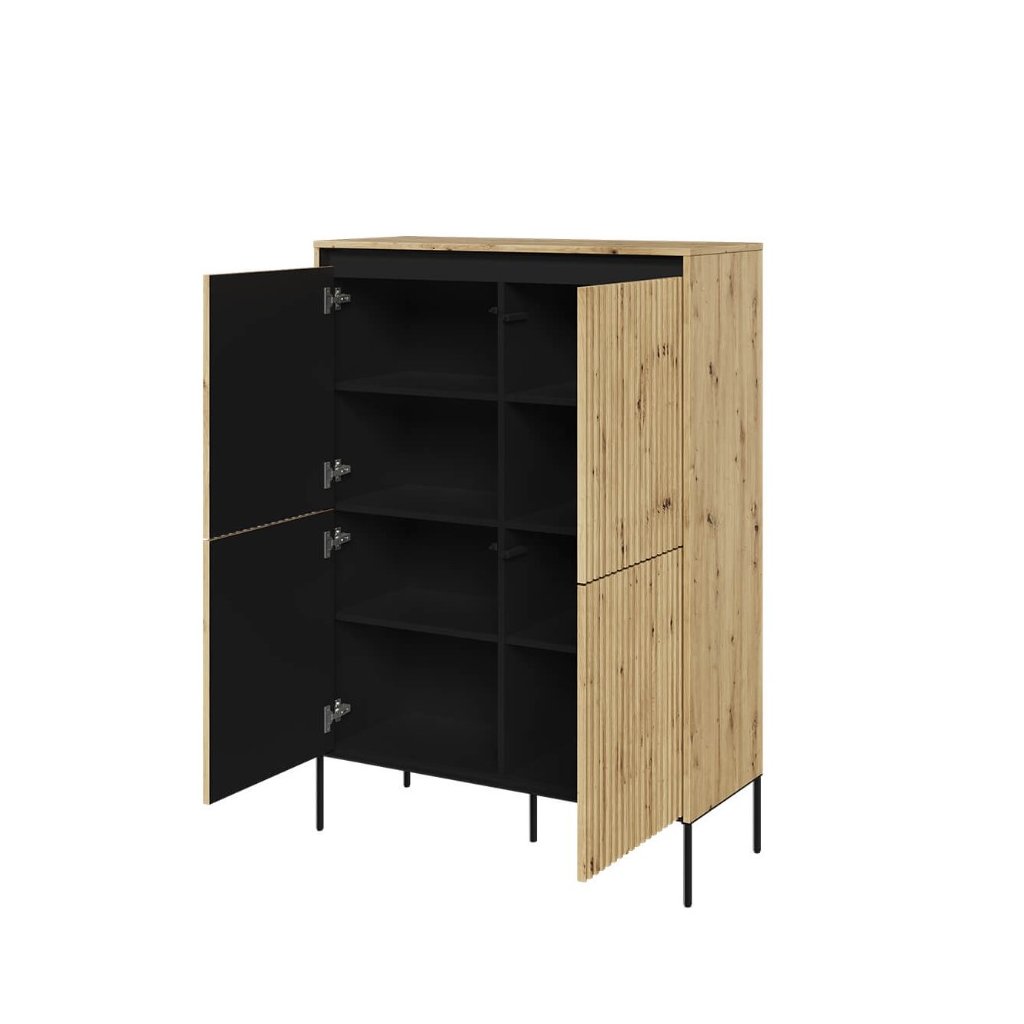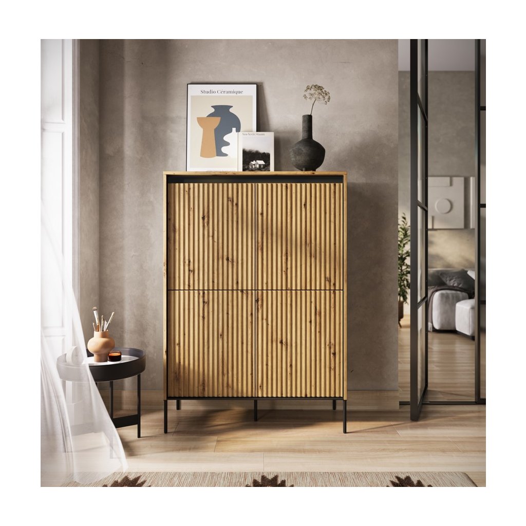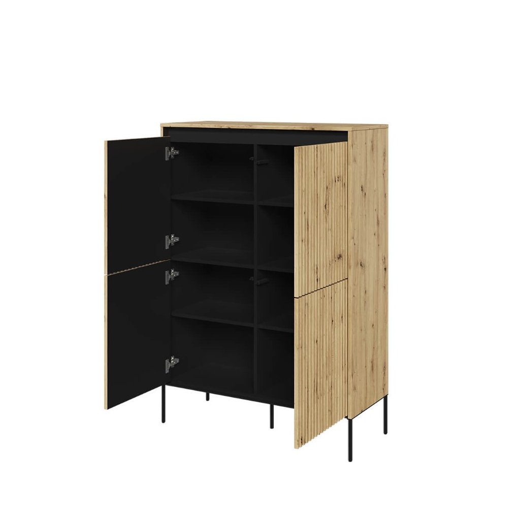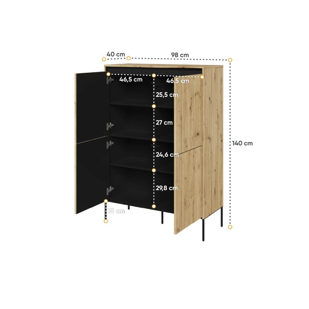 Az elegáns SWING TR-03 fiókos szekrény modern, kézműves tölgy színben , kiváló minőségű anyagokból készült. A fiókos szekrény NYOMÁSRA NYITÓ rendszerrel rendelkezik , amely lehetővé teszi a könnyű és kényelmes nyitást és zárást fogantyúk nélkül. A léces ajtódizájn egy újabb esztétikai elem, amely jellegzetes bájt és stílust kölcsönöz a helyiségnek. Az elegáns fekete fém lábak könnyedséget kölcsönöznek az összképnek, növelik a stabilitást és a tartósságot. A komód ára tartalmazza a LED világítást. A komód szétszerelt állapotban kerül kiszállításra.