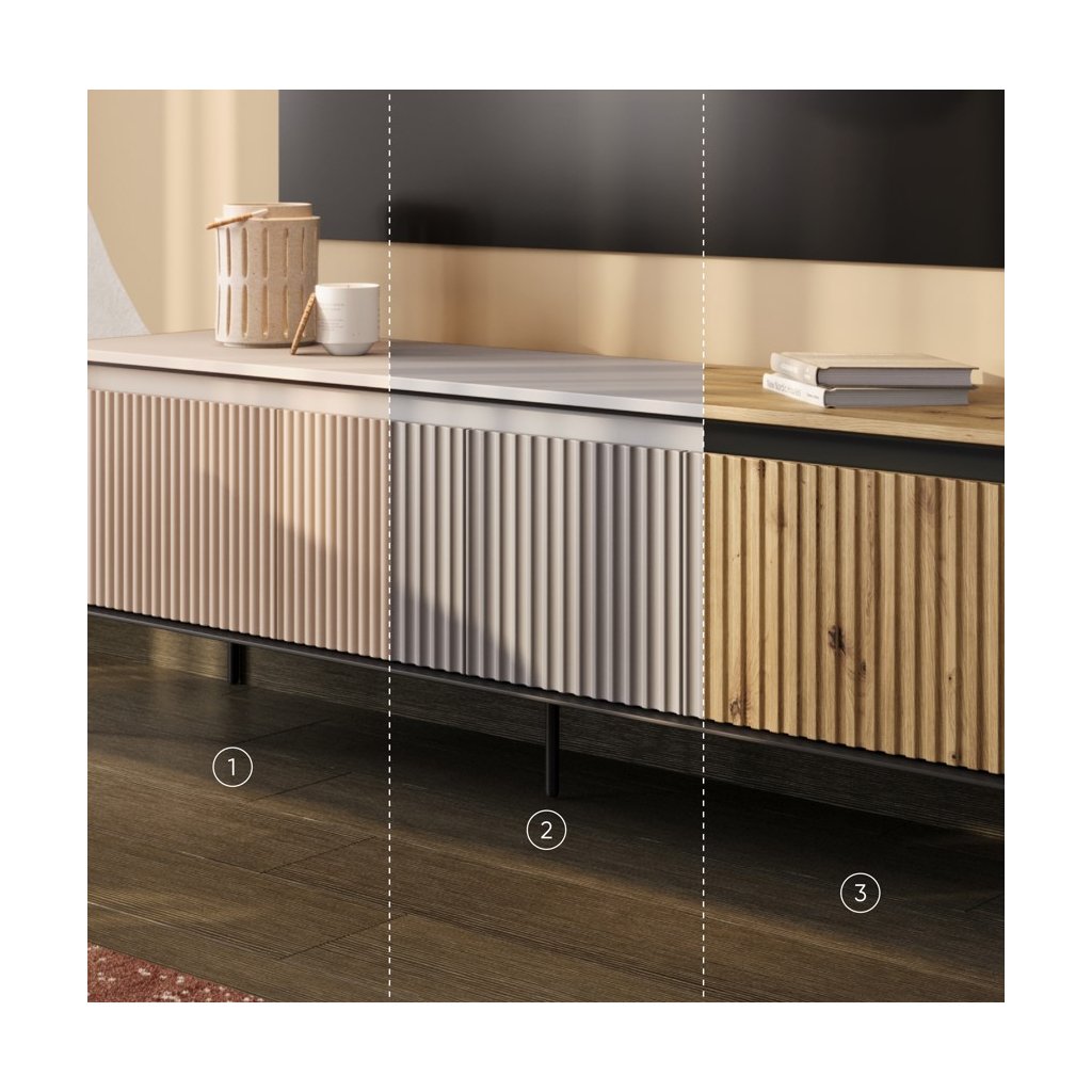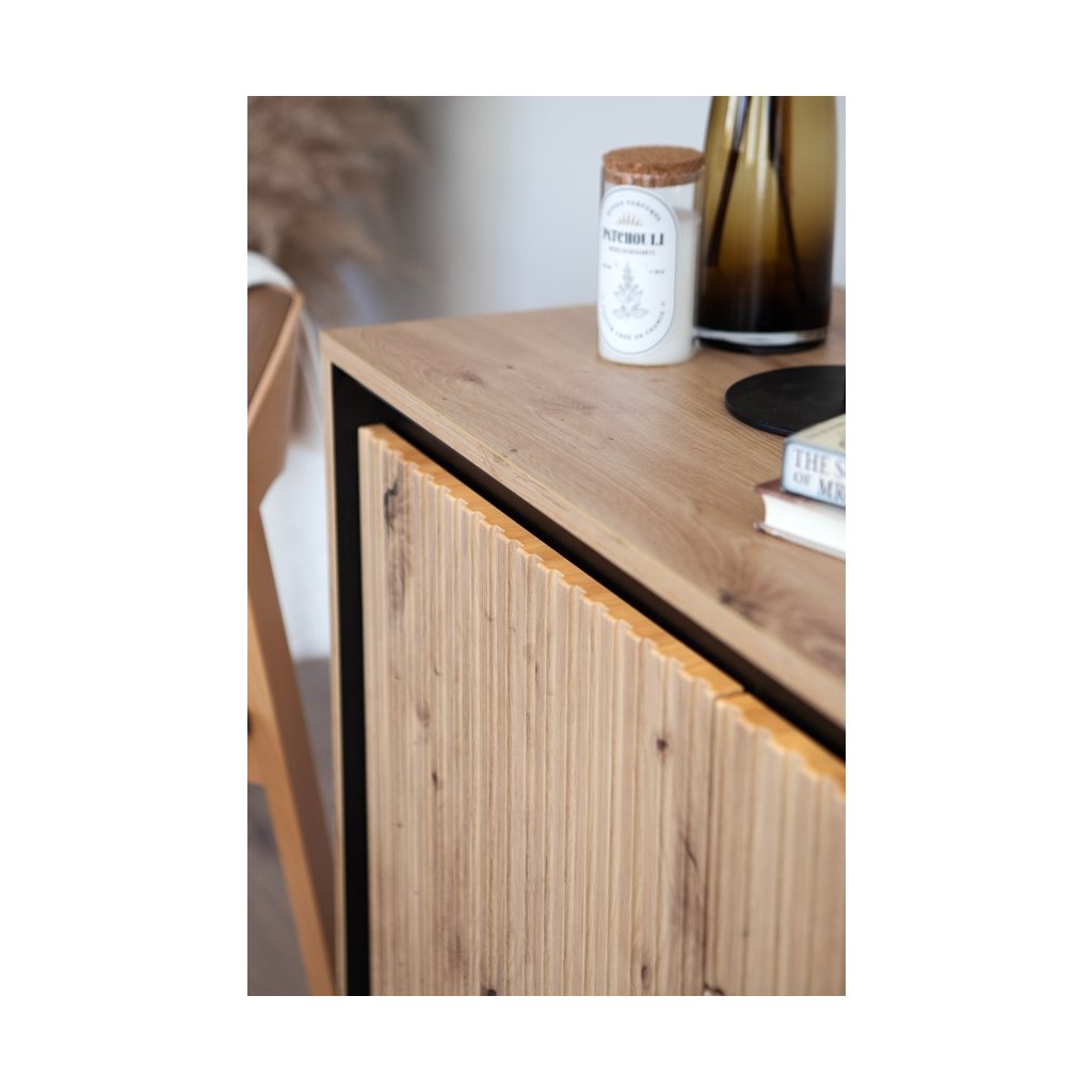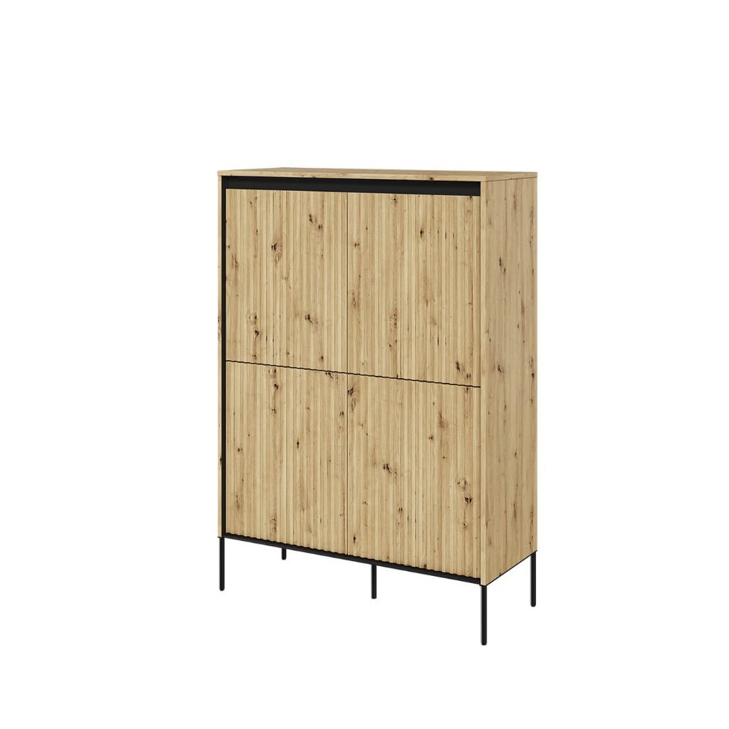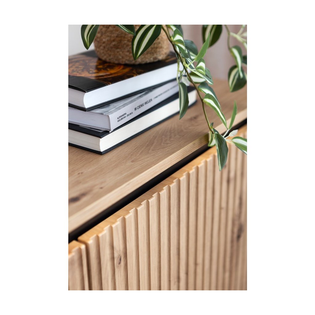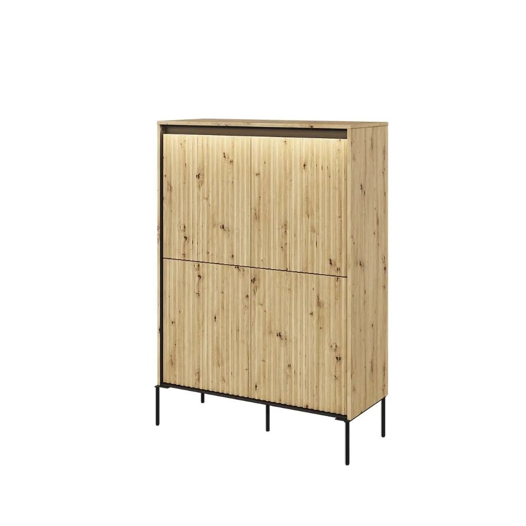 Az elegáns SWING TR-03 fiókos szekrény modern, kézműves tölgy színben , kiváló minőségű anyagokból készült. A fiókos szekrény NYOMÁSRA NYITÓ rendszerrel rendelkezik , amely lehetővé teszi a könnyű és kényelmes nyitást és zárást fogantyúk nélkül. A léces ajtódizájn egy újabb esztétikai elem, amely jellegzetes bájt és stílust kölcsönöz a helyiségnek. Az elegáns fekete fém lábak könnyedséget kölcsönöznek az összképnek, növelik a stabilitást és a tartósságot. A komód ára tartalmazza a LED világítást. A komód szétszerelt állapotban kerül kiszállításra.