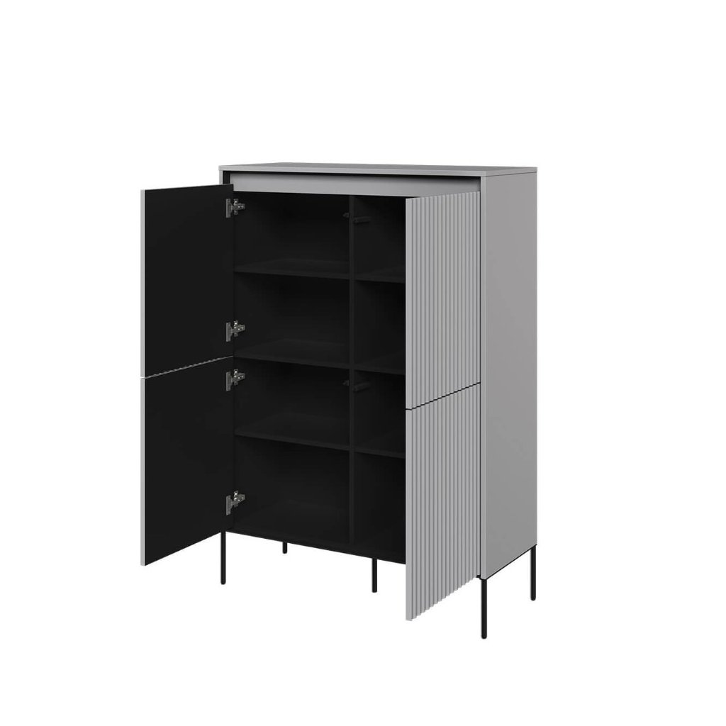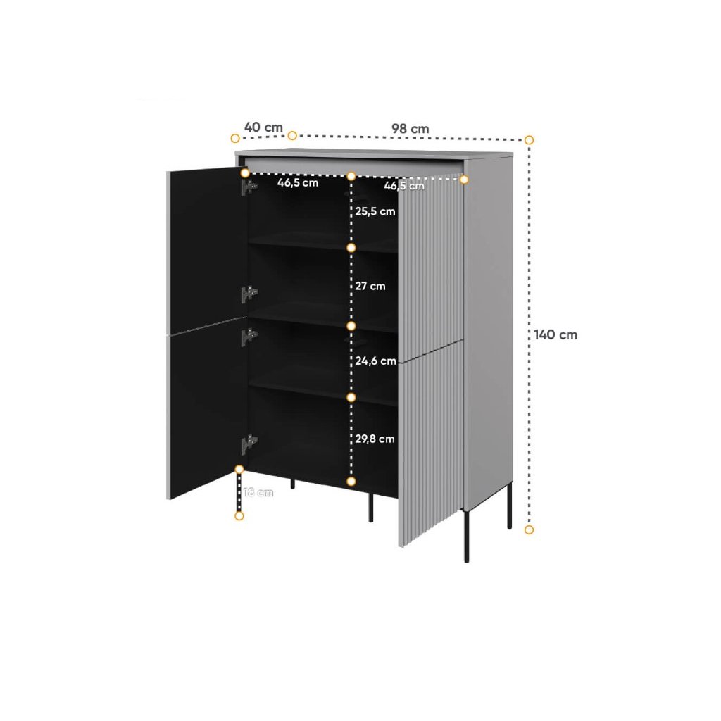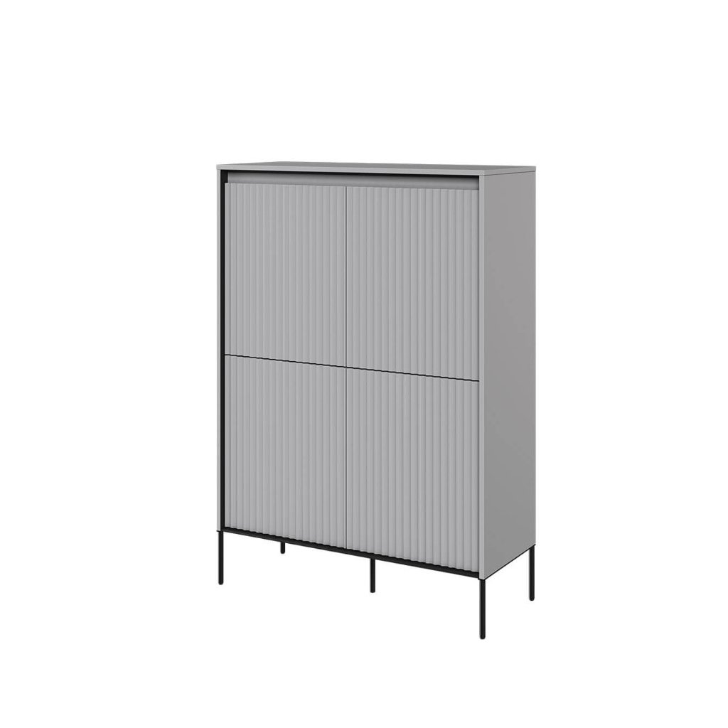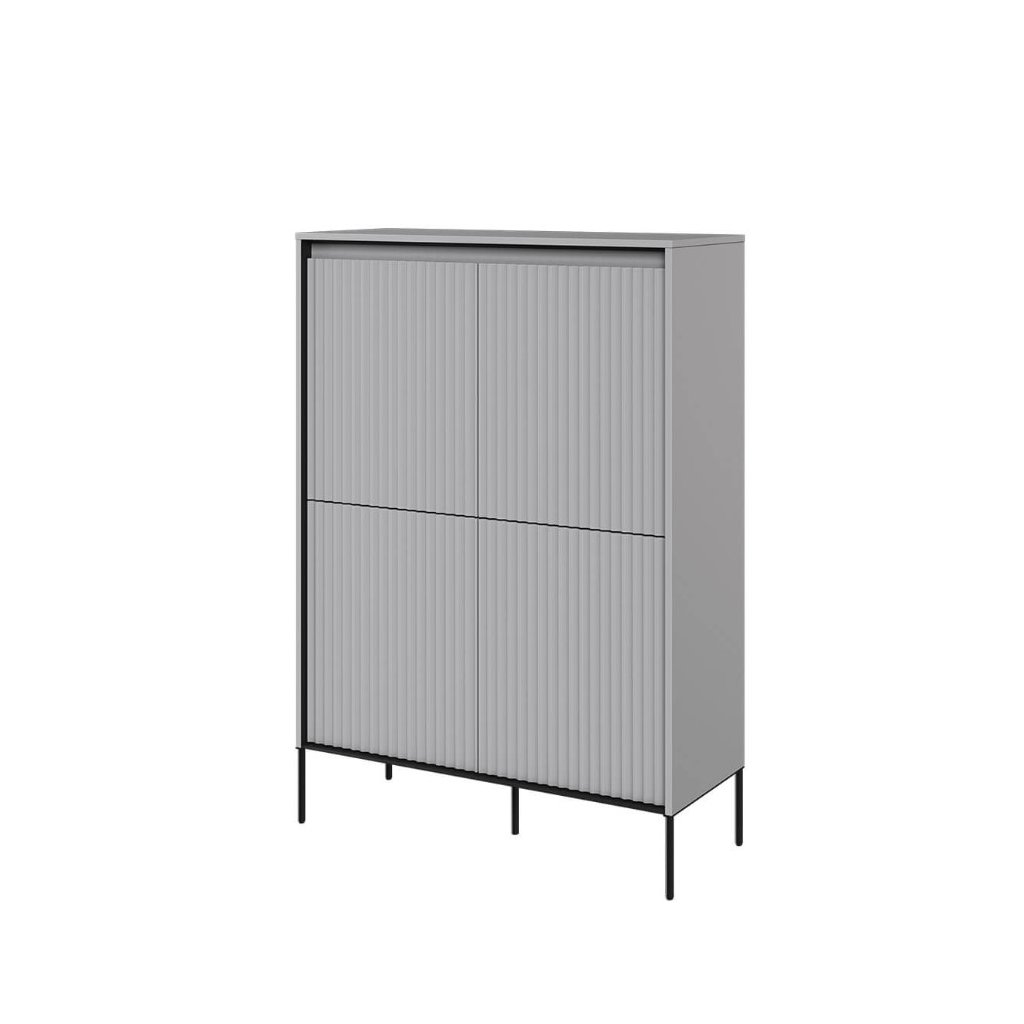 Az elegáns SWING TR-03 fiókos komód modern szürke színben , kiváló minőségű anyagokból készült. A fiókos szekrény NYOMÁSRA NYITÓ rendszerrel rendelkezik , amely lehetővé teszi a könnyű és kényelmes nyitást és zárást fogantyúk nélkül. A léces ajtódizájn egy újabb esztétikai elem, amely jellegzetes bájt és stílust kölcsönöz a helyiségnek. Az elegáns fekete fém lábak könnyedséget kölcsönöznek az összképnek, növelik a stabilitást és a tartósságot. A komód ára tartalmazza a LED világítást. A komód szétszerelt állapotban kerül kiszállításra.