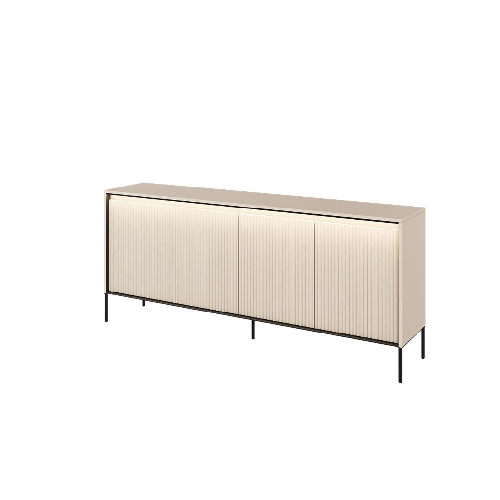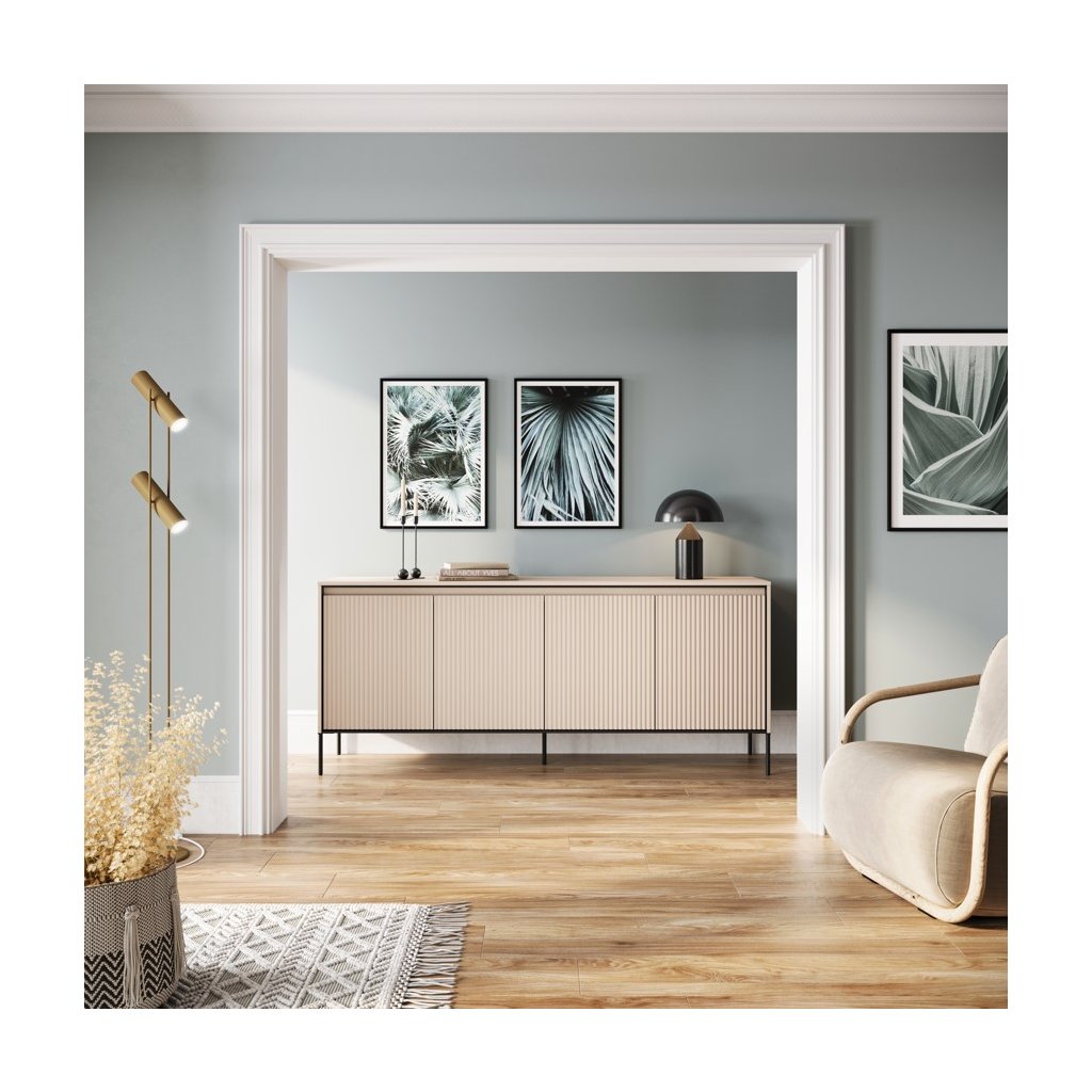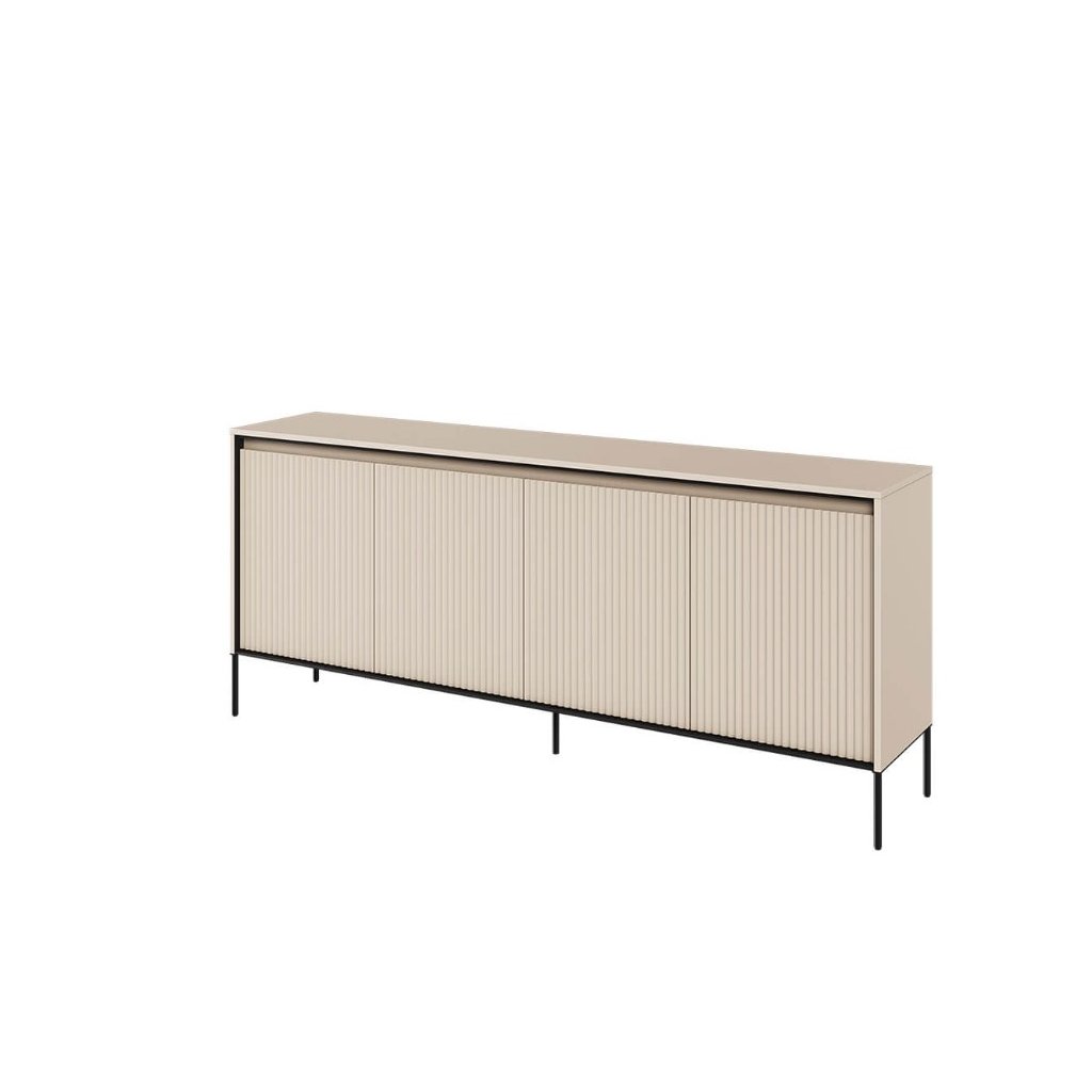 Az eredeti SWING TR-04 fiókos szekrény modern bézs-homok színben , kiváló minőségű anyagokból készült. A fiókos szekrény NYOMÁSRA NYITÓ rendszerrel rendelkezik , amely lehetővé teszi a könnyű és kényelmes nyitást és zárást fogantyúk nélkül. A léces ajtódizájn egy újabb esztétikai elem, amely jellegzetes bájt és stílust kölcsönöz a helyiségnek. Az elegáns fekete fém lábak könnyedséget kölcsönöznek az összképnek, növelik a stabilitást és a tartósságot. A komód ára tartalmazza a LED világítást. A komód szétszerelt állapotban kerül kiszállításra.