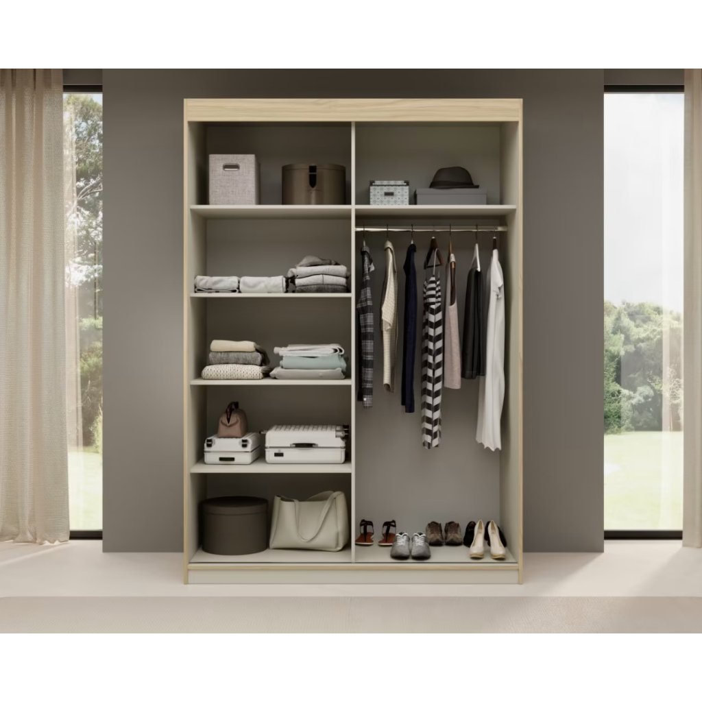 A tölgyfa dizájnú ATSON gardrób remek kiegészítője a különféle enteriőröknek – a klasszikustól a skandináv stíluson át a modern dizájnig. Ideális választás azok számára, akik a funkcionalitás és az esztétikus megjelenés kombinációját keresik , harmonikus és praktikus teret teremtve otthonukban. Gardrób kellemes tölgy színben, bézs kombinációval. A szekrény két 200 cm széles ajtóval rendelkezik.