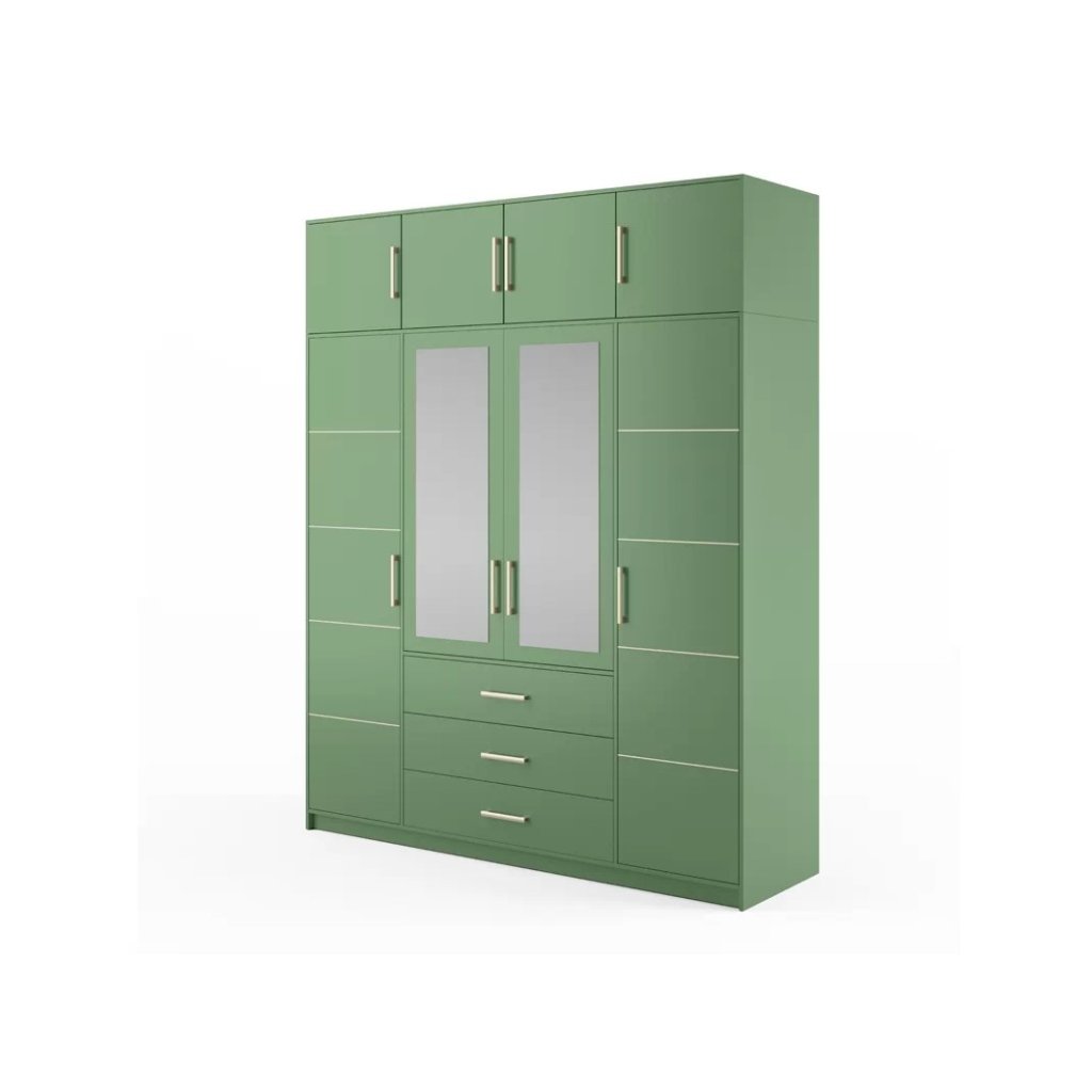 Elkészült a BALI gardrób kiváló minőségű laminált anyagokból 16 mm vastagsággal. Megvan tömör műanyag fogantyúk. ABS él növeli sérülésekkel szembeni ellenállás és megvédi a bútort a nagyobb mechanikai igénybevételtől. A tükrök az ajtóra vannak ragasztva.