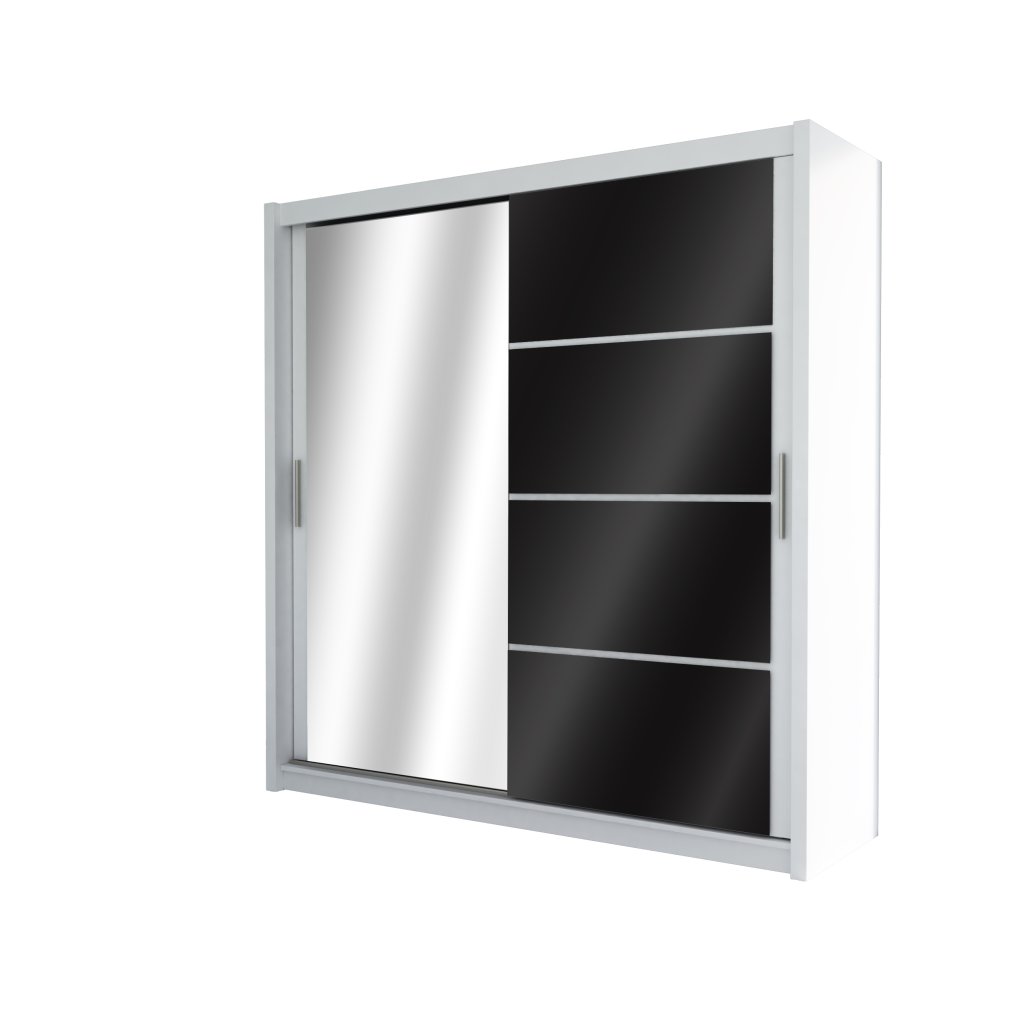 Szokatlan BRANDON 150 gardróbszekrény fehér színben, fekete üveg kombinációval. A BRANDON tükrös gardróbszekrény tágas, polcokkal és ruhaakasztó rúddal. A BRANDON gardrób otthona tökéletes részévé válik.