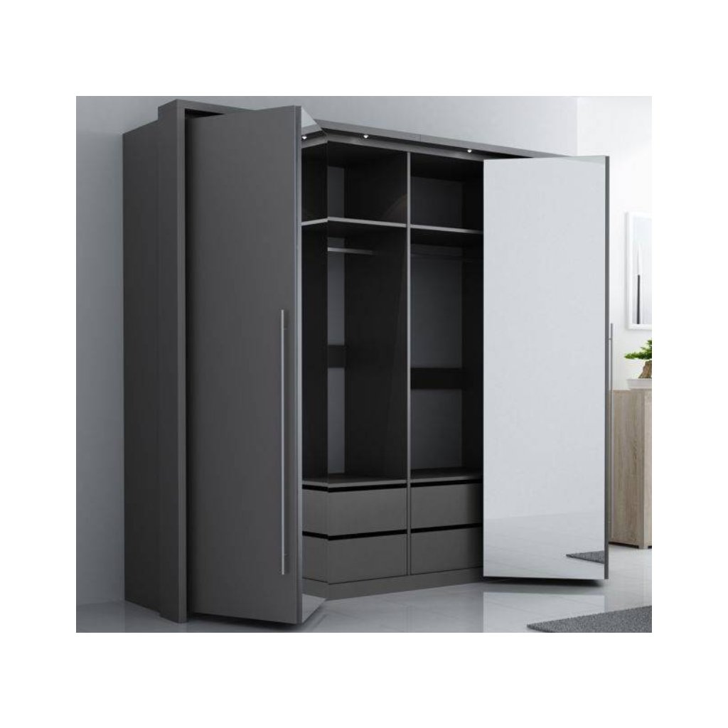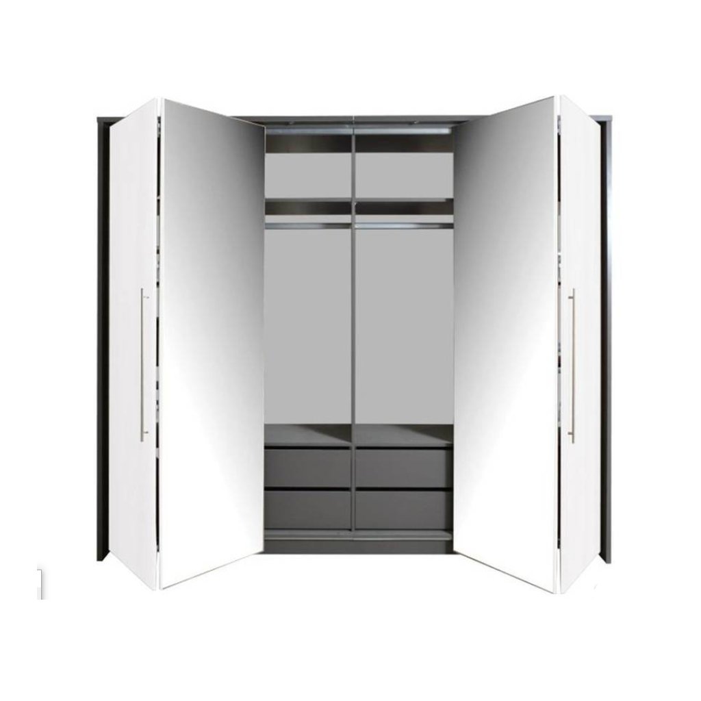 Gardrób A BREMA rendelkezik alumínium sínek a könnyebb és kényelmesebb mindennapi használat érdekében. Az üveg a szekrényajtóra van ragasztva. Az ajtó oldalain védőcsíkok vannak tömítéssel (csiszolt). A szekrény egyedi és szokatlan ajtónyitó rendszerrel rendelkezik. Az ajtók zsanérokkal és kiváló minőségű HETTICH márkájú vasalatokkal vannak felszerelve. Tisztítása egyszerű, csak nedves ruhával törölje le.
