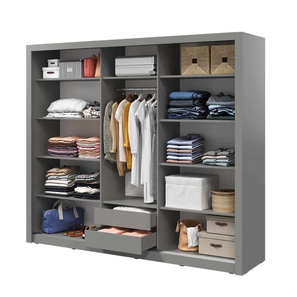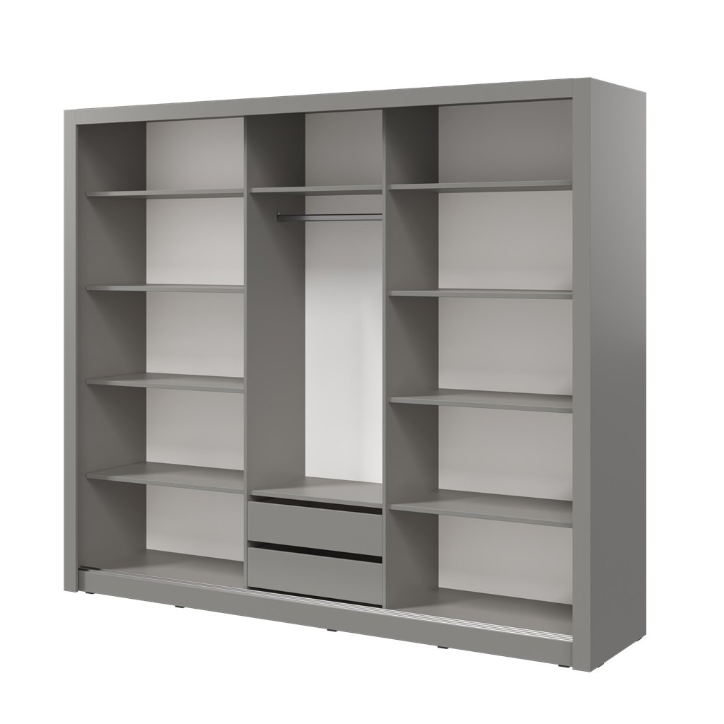 Szektorbútor A DELILA puha és elegáns hálószobabútor , többféle színben kapható. A keretezésnek köszönhetően a bútor masszívnak tűnik, a fogantyúk fémek, modern megjelenést kölcsönöznek a bútornak. Kellemesen és kényelmesen fogja érezni magát a hálószobában, zavartalan alvást élvezhet. A gardróbszekrényekben, komódokban bőven van tárhely, nem lesz gond a ruhák tárolásával. Ha tökéletes hálószobát szeretne, rendezze el a DELILA szekcionált bútorokból . A DELILA ID-11 gardrób tolóajtós, középen egy tükör található. A szekrény belseje polcokból, szekrényrúdból és 2 fiókból áll.