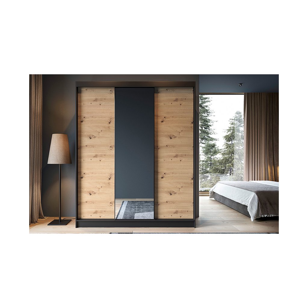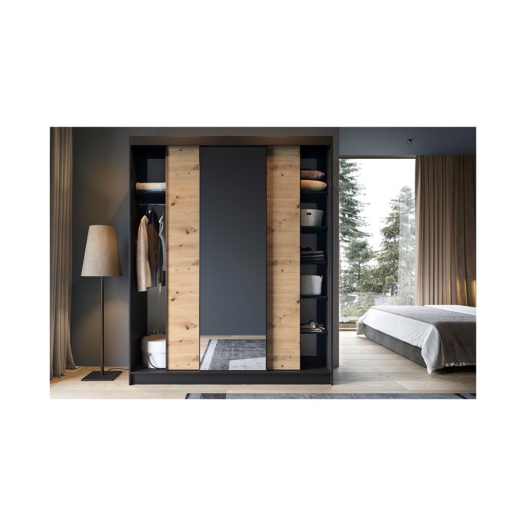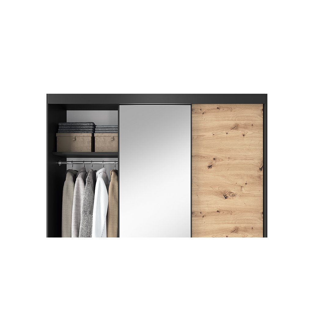 Amikor az ESVILLE III tükrös tolóajtós gardróbot választja, egy olyan bútordarabot kap, amely nemcsak tárolási igényeit elégíti ki, hanem stílust és eleganciát is kölcsönöz a térnek. A rendszerezés élvezet lesz, a mindennapi előkészületek pedig még kényelmesebbek. A tolóajtók praktikussága mellett az ESVILLE III tükrös tolóajtós gardrób beépített tükörrel is rendelkezik , amely optikai mélységet ad, és segít gyorsan kiválasztani a megfelelő öltözéket. A tölgy és a matt mélyfekete finom kombinációja harmonikus kompozíciót teremt, amely egy csipetnyi luxust visz az enteriőrbe.