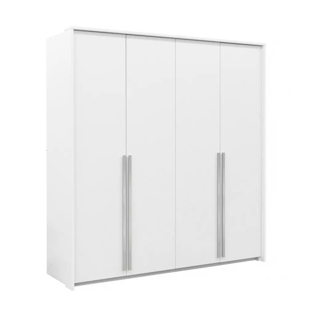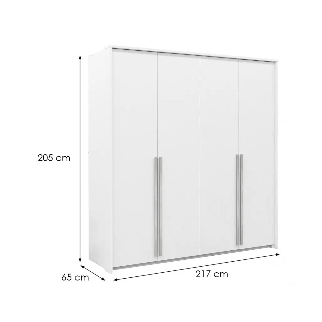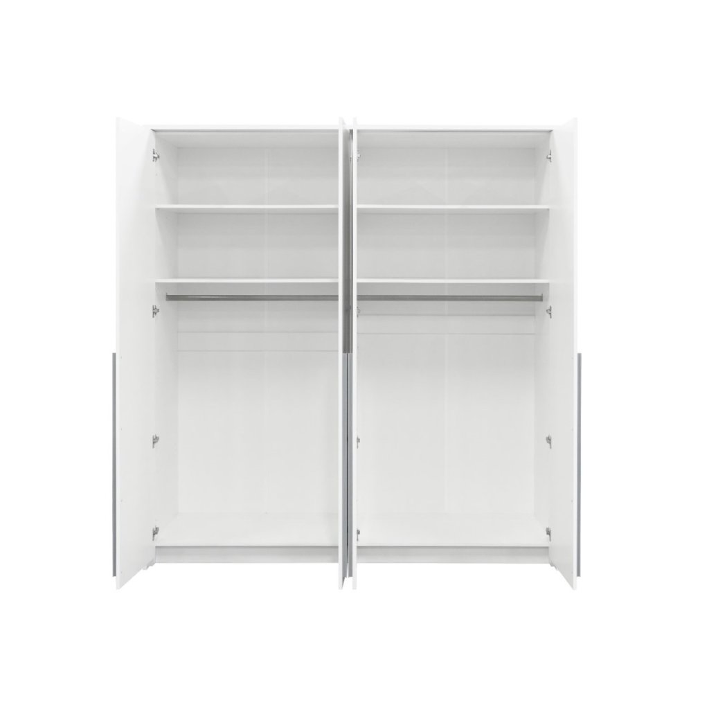 A GENUA 210 gardrób a funkcionalitás és az elegancia kvintesszenciája. A szimmetrikus dizájnnal és az intenzív fehér és ezüst árnyalatok kombinációjával ez a 4 ajtós modell egyedi karaktert kölcsönöz hálószobájának. Tágas belső teret kínál, hosszú fém fogantyúkkal, akasztórudakkal és minden részében két polccal, így nem csak tágas, hanem vonzó is. A GENOA gardrób a báj és a kényelem jegyében készült, nem csak tágas, de stílusos is és elegendő helyet biztosít a gardróbban.