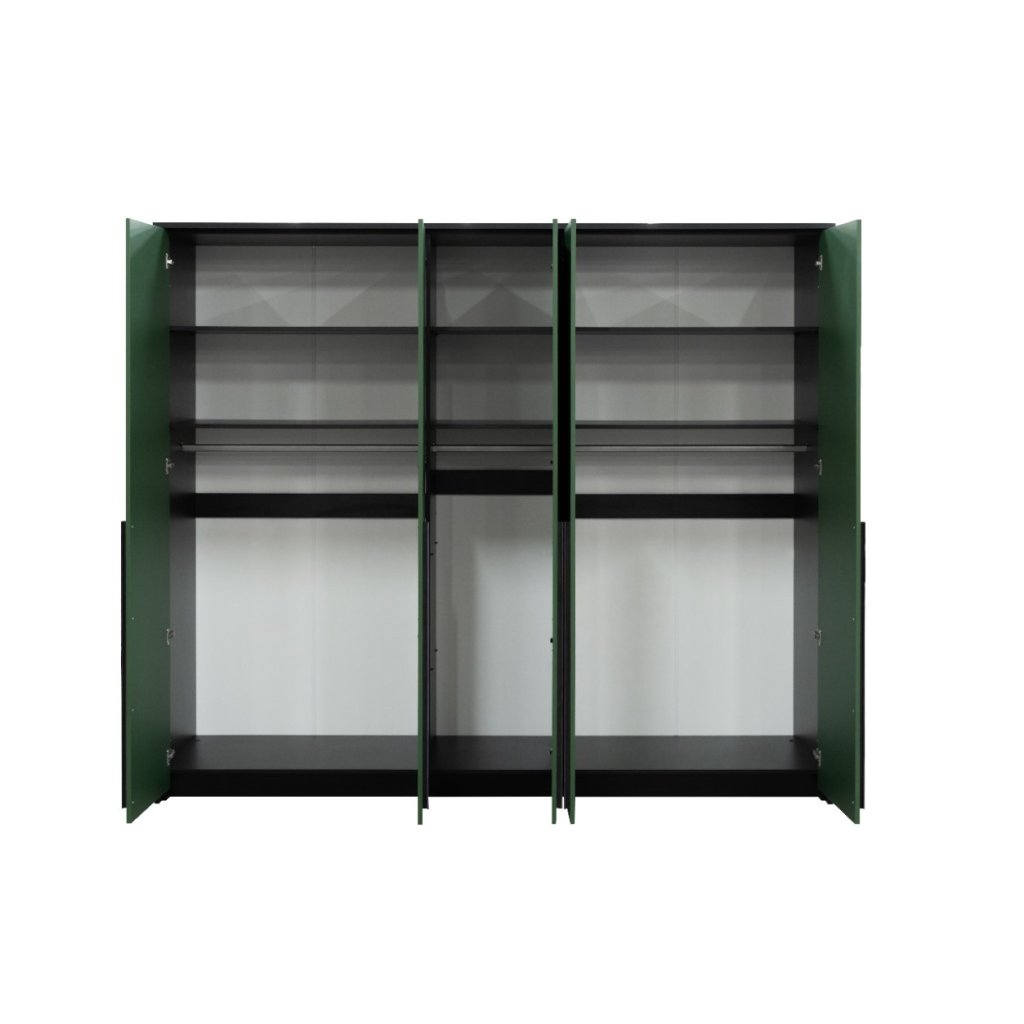 A GENUA zöld gardrób a modern stílus és a praktikum tökéletes kombinációja. Öt ajtajával, három rudakkal és polcokkal ellátott részével, valamint hosszú fém fogantyúival kivételes teret és funkcionalitást kínál. Tökéletes választás azok számára, akik a minimalista dizájnt kedvelik. A GENUA gardrób három részből áll, praktikus sínekkel és polcokkal, amelyek elegendő helyet biztosítanak ruhái és kiegészítői szervezett tárolására. A hosszú fém fogantyúk nem csak a használatot könnyítik meg, hanem jellegzetes díszítő elemet és egyedi varázst adnak a gardróbnak.
