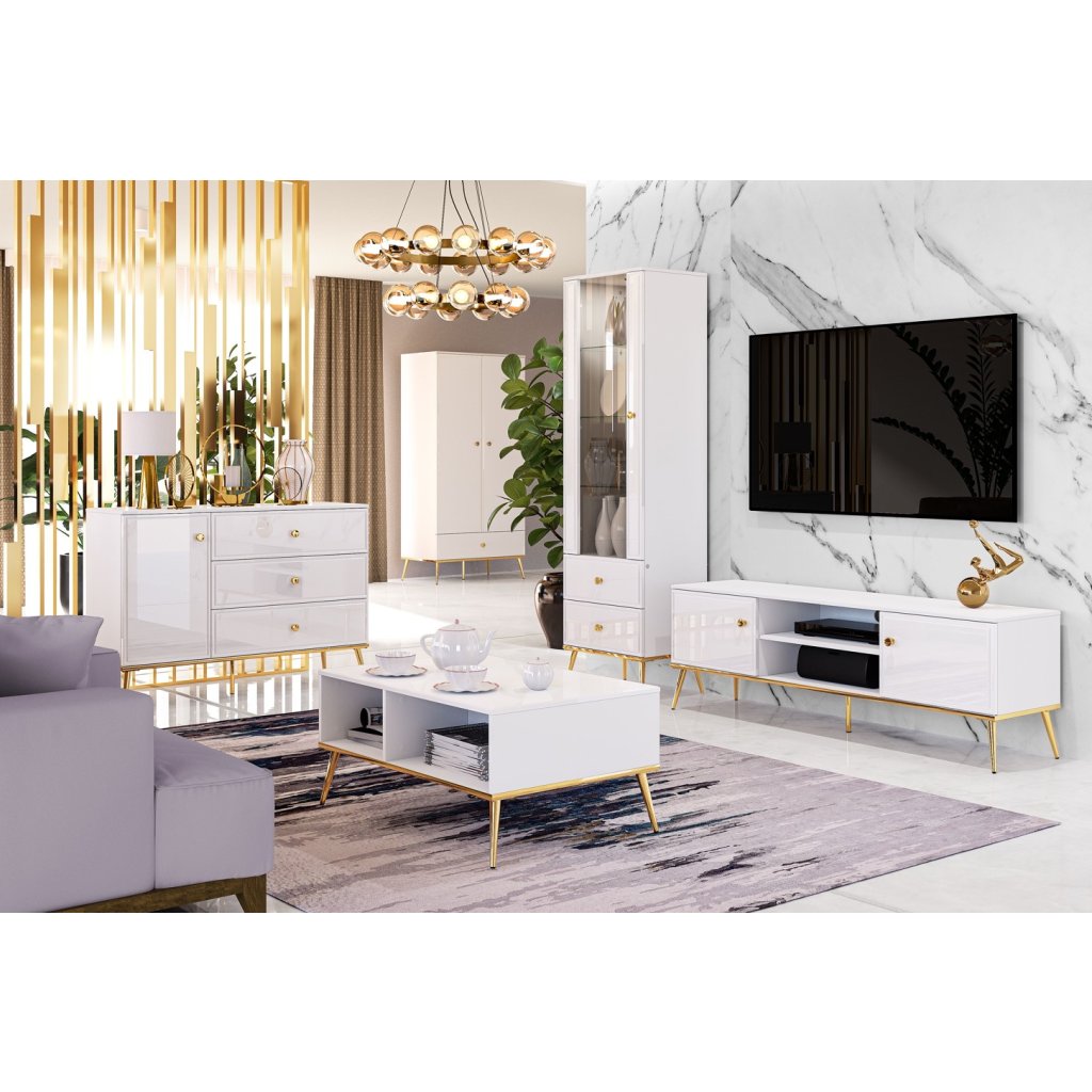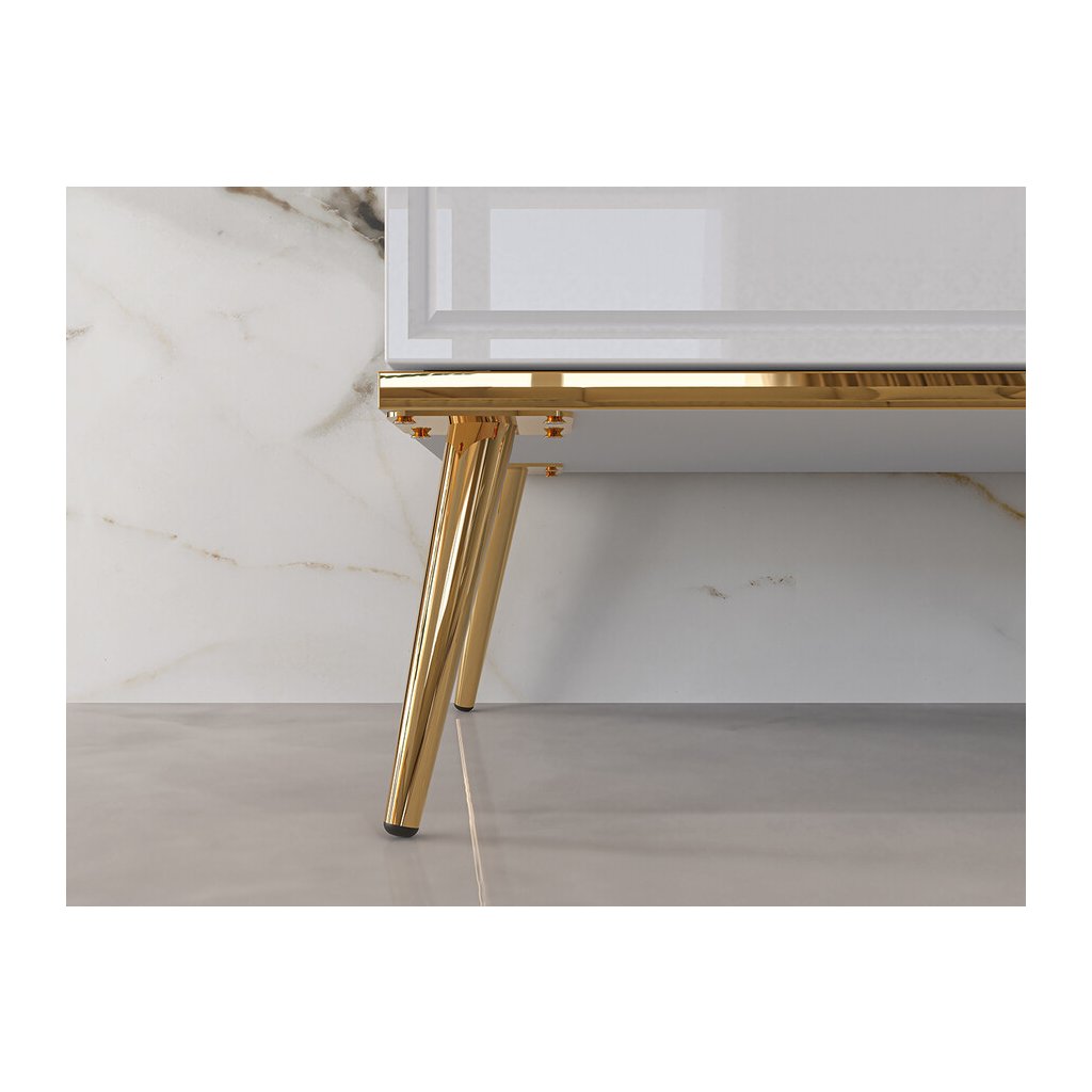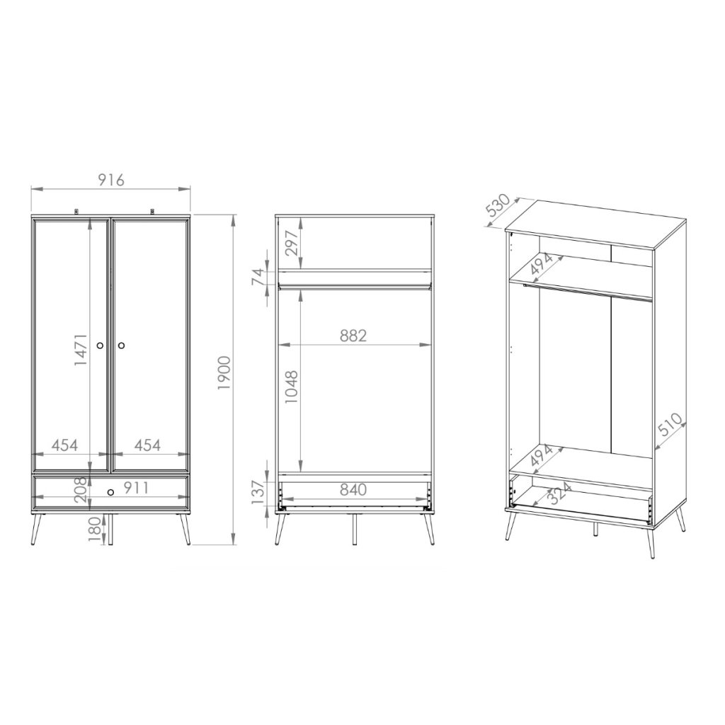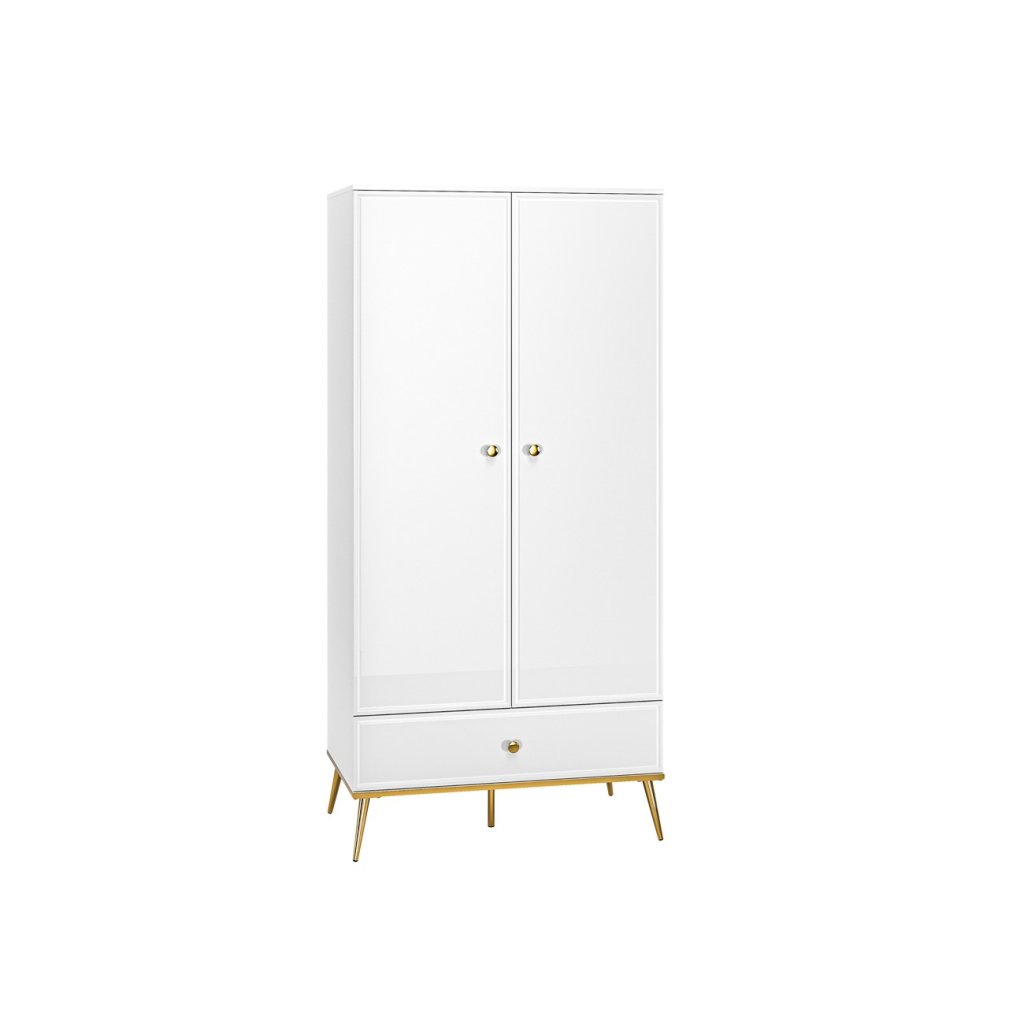 A GORDON 01 gardróbszekrény stílusos kialakítását különösen a modern és dizájner belső terek tulajdonosai értékelni fogják. A lágy és letisztult szettakat a szemet gyönyörködtető , magas, arany lábak és az azonos színű fogantyúk teszik élénkebbé. Az azonos nevű kollekcióból származó GORDON 01 gardróbszekrény feldobja a belső teret és minden látogatót lenyűgöz . A gardróbszekrény kétajtós, praktikus fiókkal, rendezze be nappaliját az Önhöz legközelebb álló stílusban.