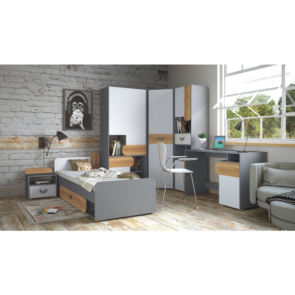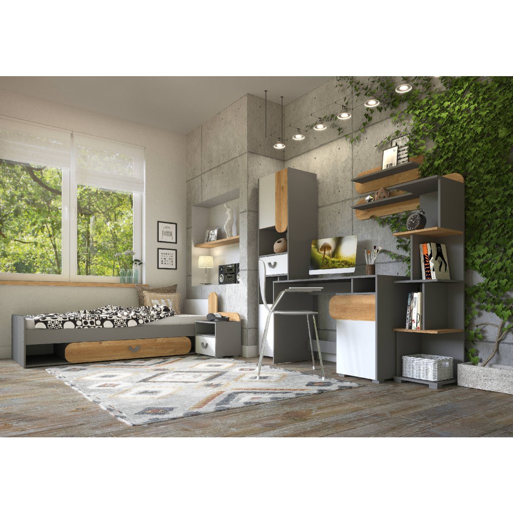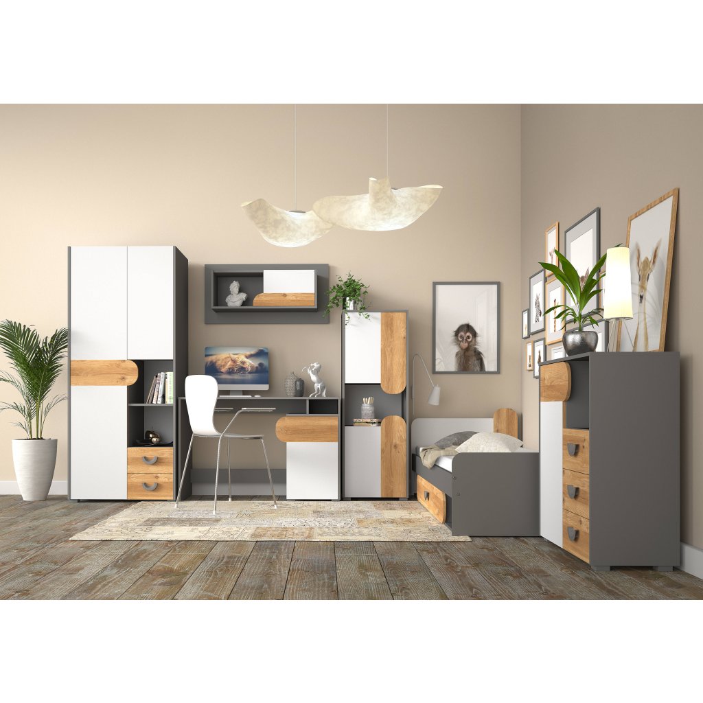 A szoba berendezésének a tinédzser igényeihez és követelményeihez való igazítása sok munkát igényelhet, de a KARINO CA2 kabinnal garantáljuk, hogy mindkét fél elégedett lesz. A stílusos dizájn modern színkombinációban, amely első pillantásra felkelti a figyelmet, minden tinédzser igényeinek megfelel. A meleg tölgy és a szürke és fehér színek kontrasztos kombinációjának köszönhetően a KARINO kollekció minden belső teret felpezsdít. A KARINO CA2 szekrény három ajtóval és nyitott polcokkal rendelkezik, amely elegendő tárolóhelyet biztosít és stílusos kialakítást kínál.