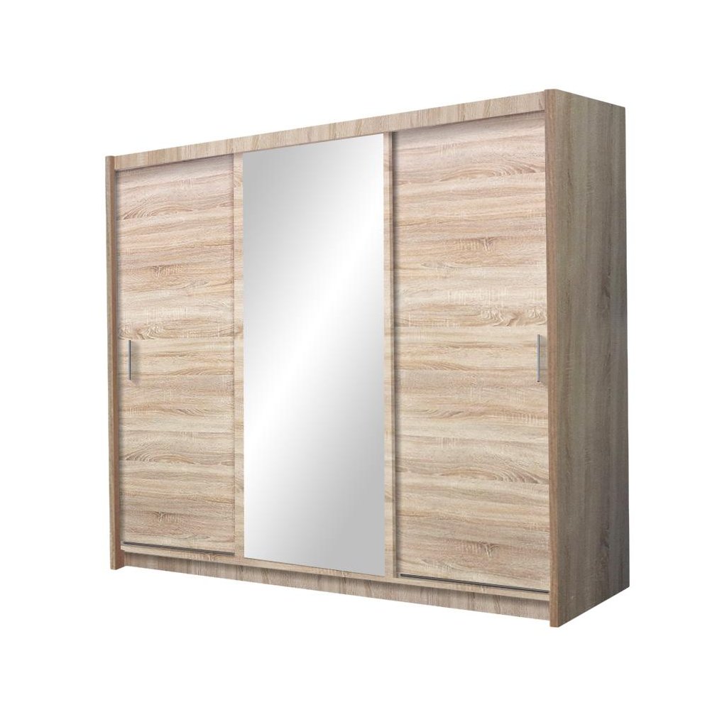 A Sonoma tölgy színű kombinált MONAKO háromajtós gardrób tükrös tolóajtókkal rendelkezik. A gardrób domináns eleme az elegáns ezüst színű fogantyúk. MONAKO gardrób sok tárolóhellyel ruháinak. A világítás nem része a szekrénynek.