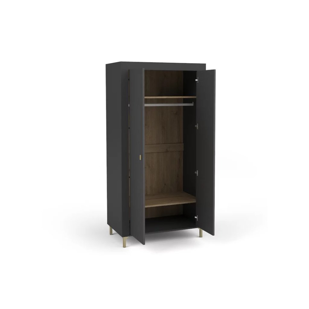 Hiányzik otthon a tárolóhely, ugyanakkor vágyik olyan bútorokra, amelyek felpezsdítik és megszépítik a belső teret ? Ez a stílusos MORASS MO1 gardrób a modern megjelenést a funkcionalitással ötvözi, így praktikus és esztétikus kiegészítője lehet gyerekszobának, hálószobának vagy előszobának. A MORASS gardrób azonnal megragadja a tekintetet az ajtón lévő eredeti, bemélyedt felületével , amely sajátos karaktert kölcsönöz neki. A szekrény kellemes fekete színű, arany fogantyúkkal és lábakkal.