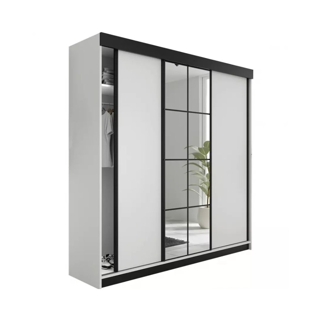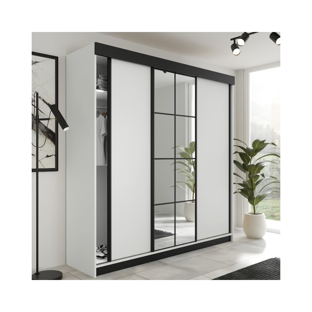 A tágas gardrób modern dizájnnal készült. A gardrób egy háromajtós, tolóajtós gardrób , az ajtaján tükörrel. A gardrób matt fehér felülettel készült és érdekes fekete díszítéssel rendelkezik.