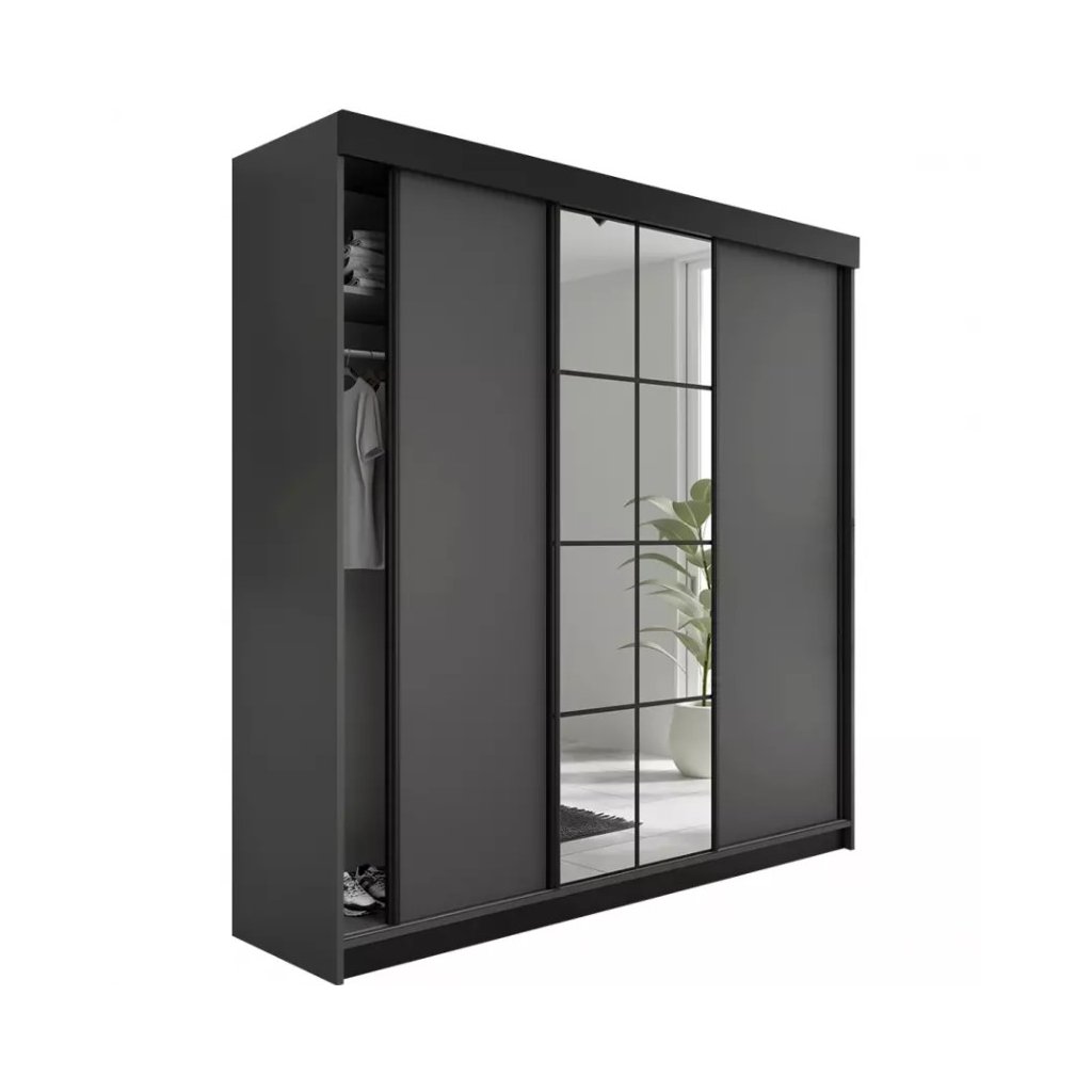 Szekrény ROMALA | grafit 200 cm készült minőségi, ellenálló anyagokból készült mechanikai sérülések . Ajtók könnyebben használható Síneken vannak. Szétszerelt állapotban szállítjuk, minden szükséges alkatrésszel és összeszerelési útmutatóval együtt. Karbantartása egyszerű - csak használjon nedves ruhát vagy bútortisztítót.