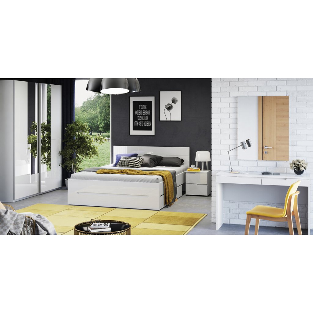 Az időtlen Selene kollekció ízléses kiegészítője lesz otthonának. A magas fehér fényű ajtó kialakítása eleganciát és luxust kölcsönöz a hálószobának vagy a nappalinak. A kényelmes ágy gondoskodik a tökéletes pihenésről, a fésülködőasztal, a gardrób vagy a komód elegendő tárolóhelyet kínál minden holmijának. Modernnek és elegánsnak tűnik, varázslatos hellyé varázsolja otthonát, amely alkalmas pihenésre és kikapcsolódásra. Számos szegmens található a kínálatban, amelyekből tetszés szerinti készletet készíthet. A Selene kollekció fogantyú nélküli rendszerrel rendelkezik. A szekrény nem csak időtálló színes dizájnban, hanem elegáns kivitelben és tökéletes megjelenésben is készül.