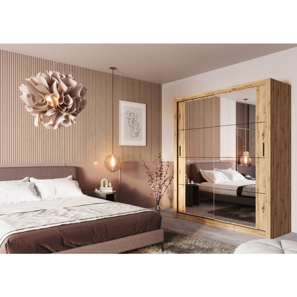 Az elegáns TIAR AR-03 tükrös gardrób tágas, polcokkal és ruhaakasztó rúddal. A TIAR gardrób kiváló minőségű anyagokból készült. Az ajtókon tükrök találhatók, amelyek optikailag megnövelik a teret, világosítják a belső teret és jelentősen befolyásolják a bútorok használatának kényelmét. Ez a tökéletes ARTI gardrób otthonod egyedi részévé válik.