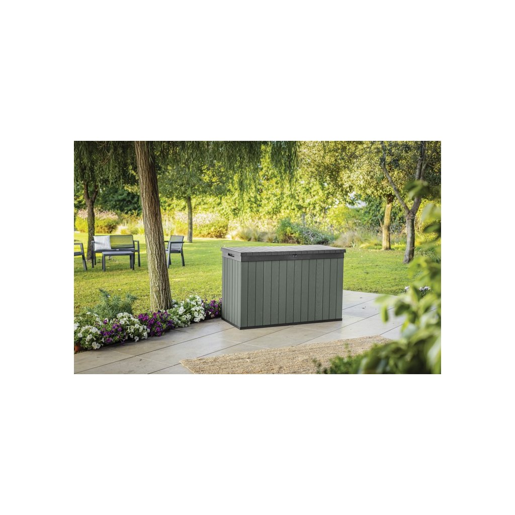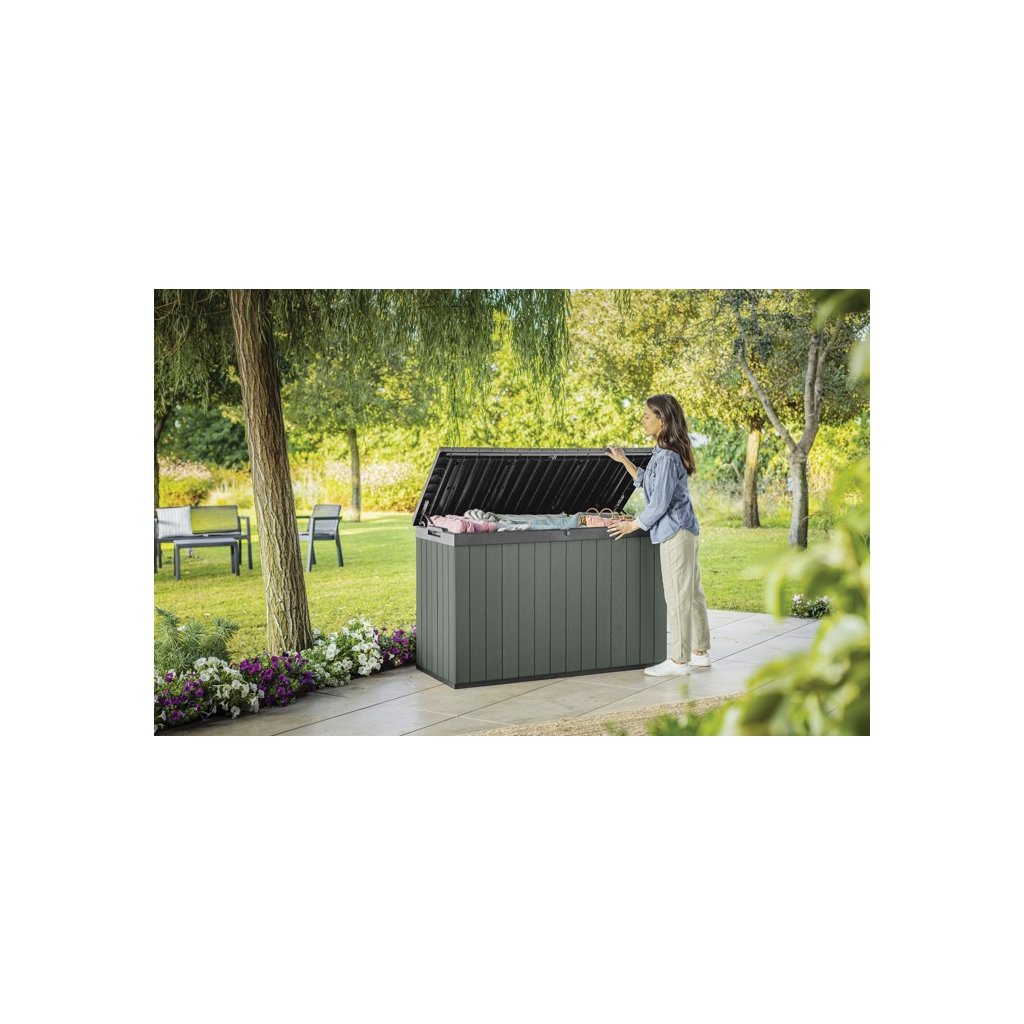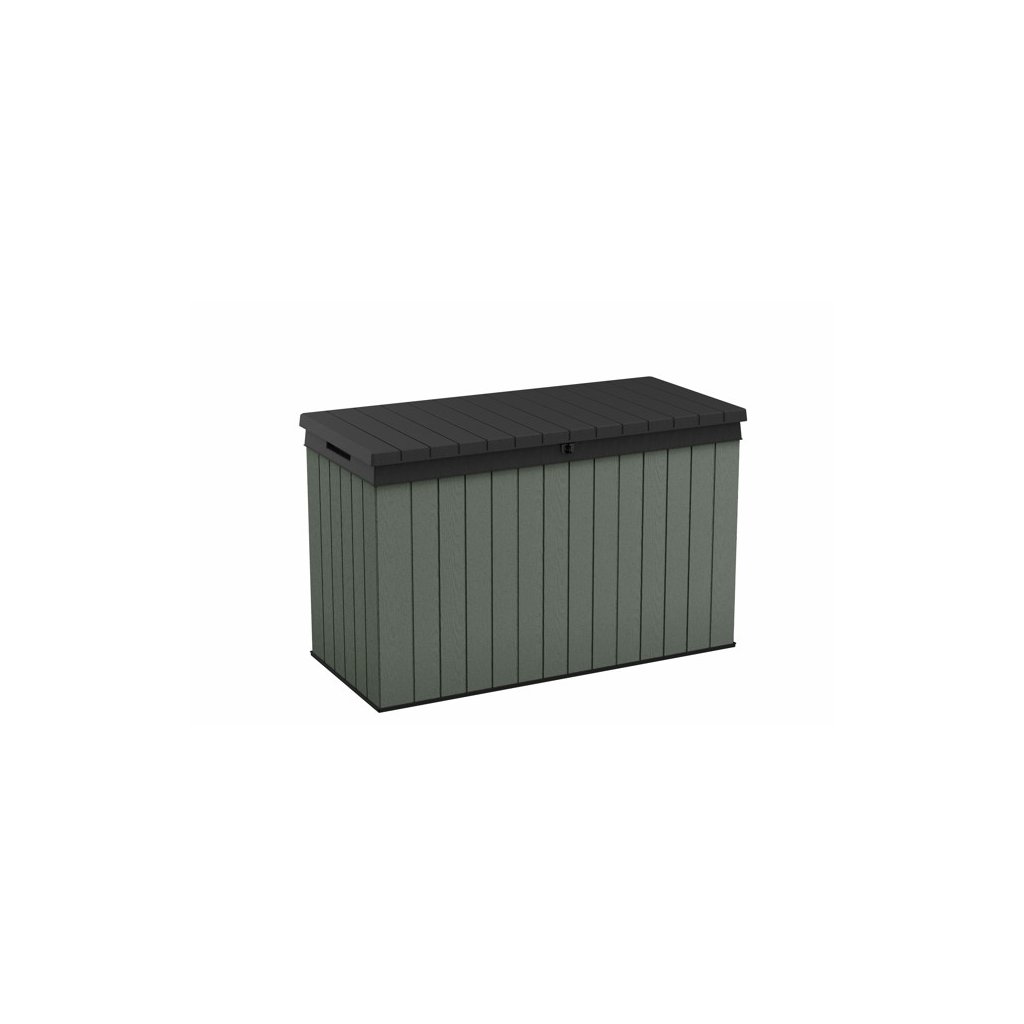 A nagy zöld DRAWINE műanyag tárolódoboz tágas megoldást kínál különféle igények tárolására a kertben vagy teraszon. A fa hatású dizájn stílusosan kiegészít minden kertet vagy teraszt. Az egyszerű használat és szállítás érdekében a doboz elülső és oldalsó fogantyúval van felszerelve , további előnye a zárható fedél.