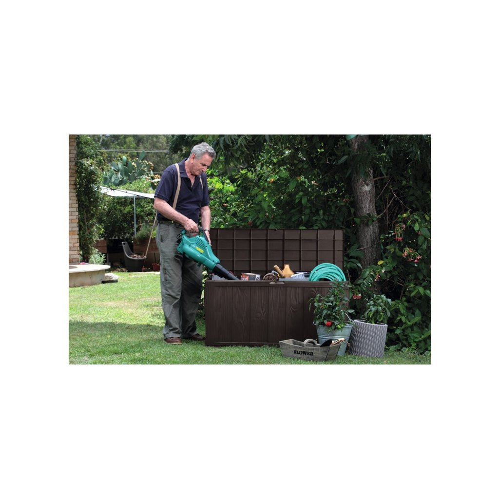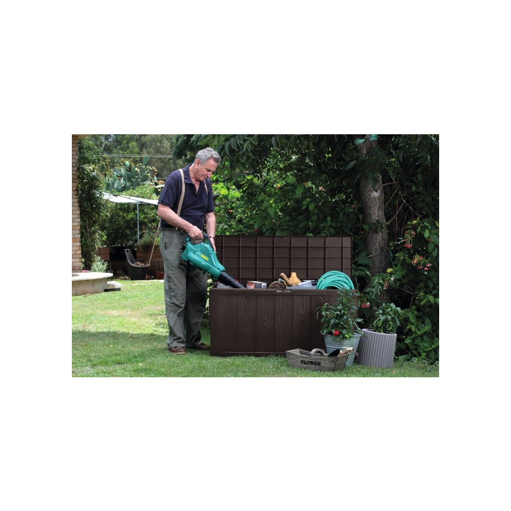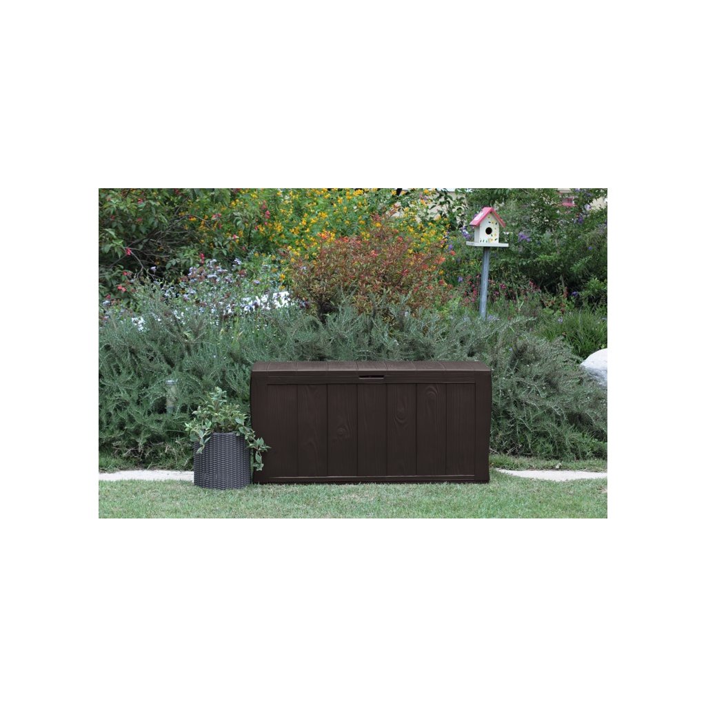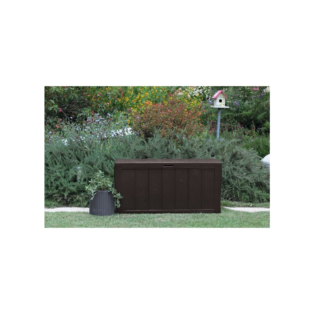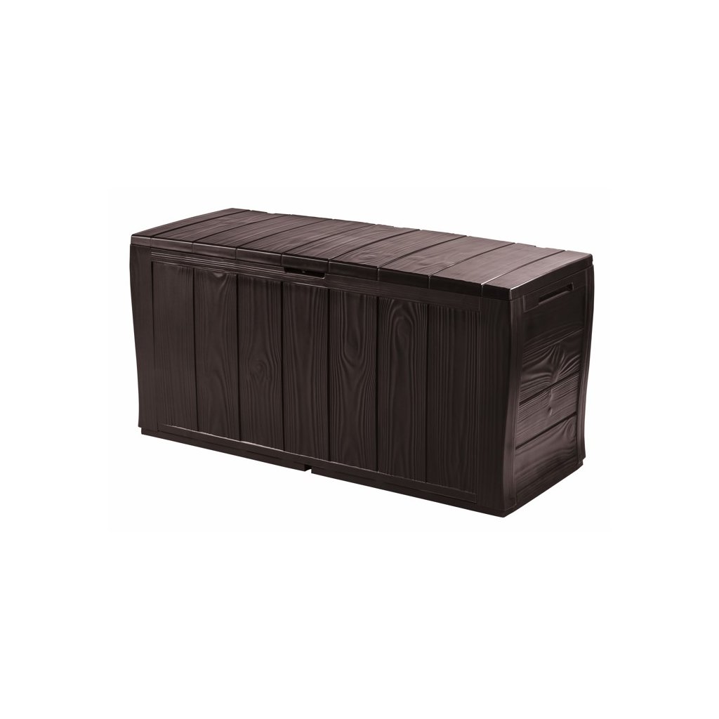 Műanyag tároló doboz WOODSHER barna 270L űrtartalommal különféle tárgyak (párnák, kerti szerszámok...) tárolására. Ennek a doboznak az előnye az egyszerű összeszerelés (szerszámok használata nélkül - mindent készletként szerel össze).