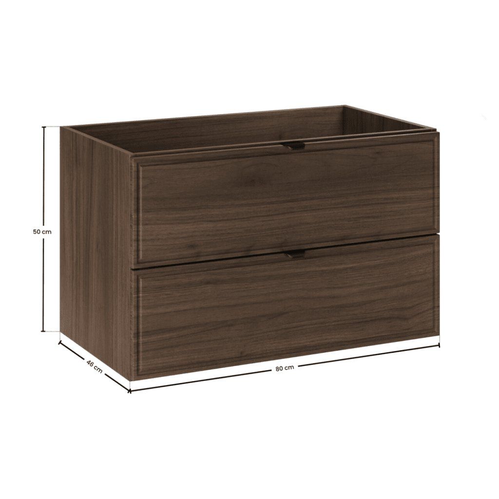Tegyen stílust és praktikumot fürdőszobájába a modern TERRA Villa fürdőszobaszekrénnyel . Az elegáns, natúr sötét diófa dekorral ellátott dizájn bármilyen enteriőrben kiemelkedik, és egyúttal elegendő helyet biztosít minden fürdőszobai kellékének. A szekrény 80 cm széles mosdókagylókhoz készült, és átgondolt kialakítása lehetővé teszi a szifon és a csövek egyszerű eltakarását. Két tágas fiók kényelmes hozzáférést biztosít a tárolt tárgyakhoz, míg a kiváló minőségű fém fogantyúk hangsúlyozzák a bútor modern megjelenését. A tartós anyagnak és felületkezelésnek köszönhetően a szekrény párás fürdőszobai környezetbe is alkalmas. Ideális választás azok számára, akik a funkcionalitás, az esztétika és a tartósság kombinációját keresik.