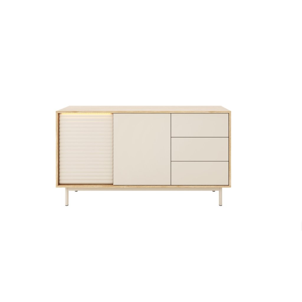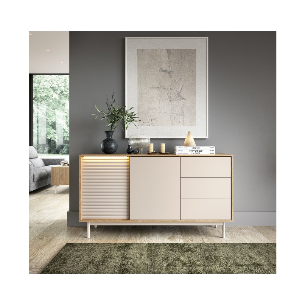 A TIALA TI3 2D3S fiókos szekrény Egy modern bútordarab, amely ötvözi az eleganciát, a funkcionalitást és az időtlen dizájnt . A világos színek, a természetes fa és a finoman barázdált homlokzatok könnyedséget, melegséget és egy csipetnyi eredetiséget kölcsönöznek a belső térnek. A magas lábaknak köszönhetően szellősnek tűnik, és az egész tér optikailag tágasabb és rendezettebb. A barázdált ajtókon található LED szalag már benne van a fiókos szekrény árában. A fiókos szekrény tágas, "NYOMÁSRA NYITVA" nyitású.