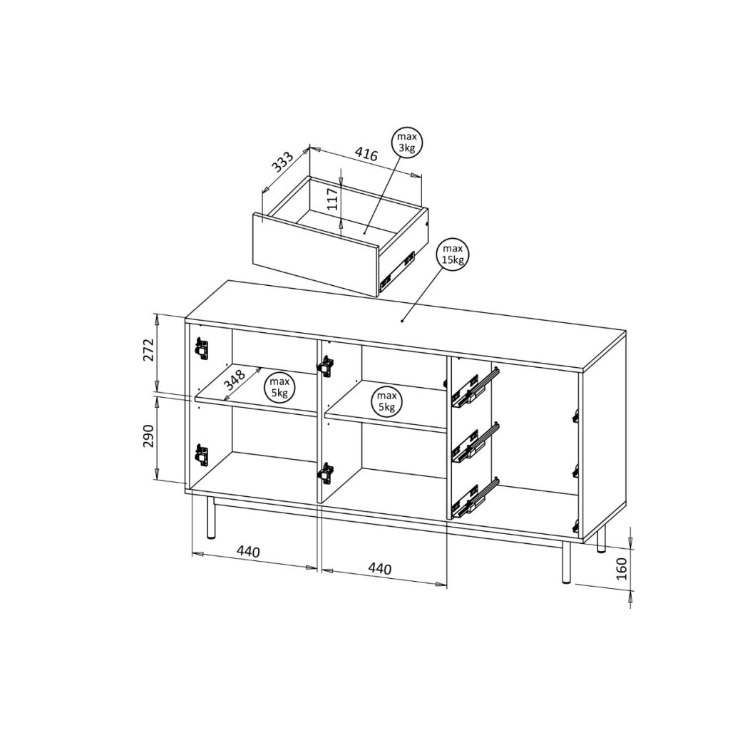 A TIALA TI3 2D3S fiókos szekrény kiváló minőségű laminált bútorlapból készült, a lekerekített élek MDF-ből. A lábak magasak, fémből és tömörek. A bútor ajtói és fiókjai csendesen záródnak. Az anyag könnyen karbantartható.