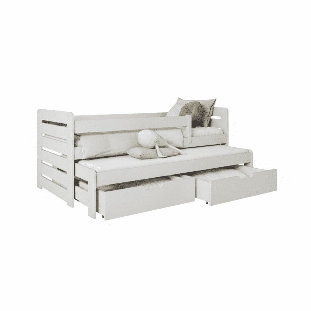 Praktikus ágyat keresel, ami helyet takarít meg és több felhasználási lehetőséget kínál? A TOMÁŠ II gyerekágy kihúzható pótággyal és fiókokkal nagyszerű megoldás bármelyik gyerekszobába. Átgondolt kialakításának köszönhetően kényelmes alvást biztosít egy vagy két gyermek számára , ugyanakkor rengeteg tárolóhelyet kínál. A modern szettak letisztultnak, időtállónak tűnnek , és könnyen kombinálhatók bármilyen stílusú bútorokkal. Az ágy nemcsak testvérek számára ideális, hanem praktikus megoldásként barátok alvásához is. Az alsó kihúzható ágy teljes értékű pótágyként szolgál , amelyet egyszerűen kihúzhatsz szükség szerint. Napközben visszatolhatod, és helyet takaríthatsz meg a szobában. Az ágy tágas fiókokkal is rendelkezik, amelyek ideálisak ágynemű, játékok vagy szezonális cikkek tárolására. Ezek segítenek a rend fenntartásában felesleges extra bútorok nélkül. Az ágyhoz tartozik egy léces ágyrács, matrac külön rendelhető .