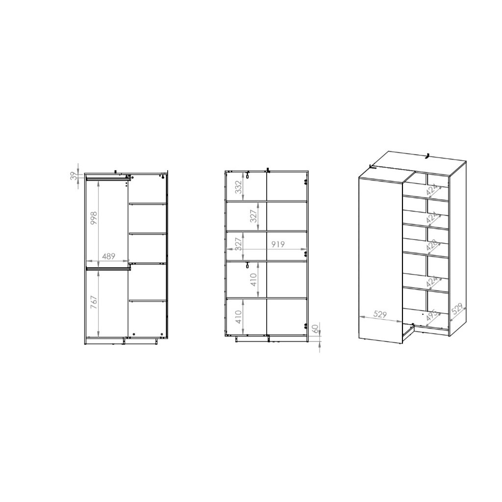 A szekrény kiváló minőségű laminált bútorlapból készült, amely ellenáll a sérüléseknek, a nedvességnek és a magas hőmérsékletnek. Az ABS él nem válik le és nem deformálódik. Az ajtók csendes záródású mechanizmussal rendelkeznek.