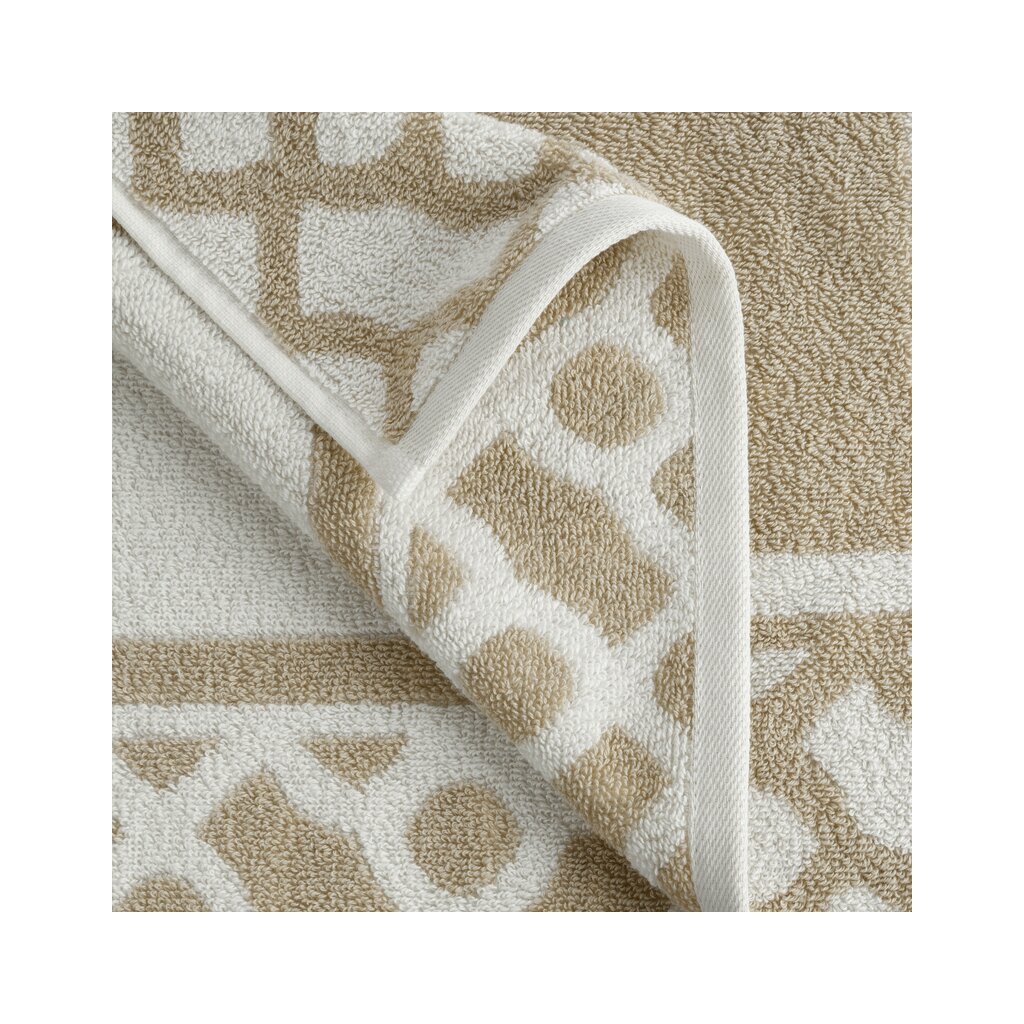 Pamut törölköző geometrikus mintával díszített szélekkel. Szélesség: 50 cm, Hossz: 90 cm, Szín: világos bézs, Súly: 500 GSM, Összetétel: Anyag: 100% pamut