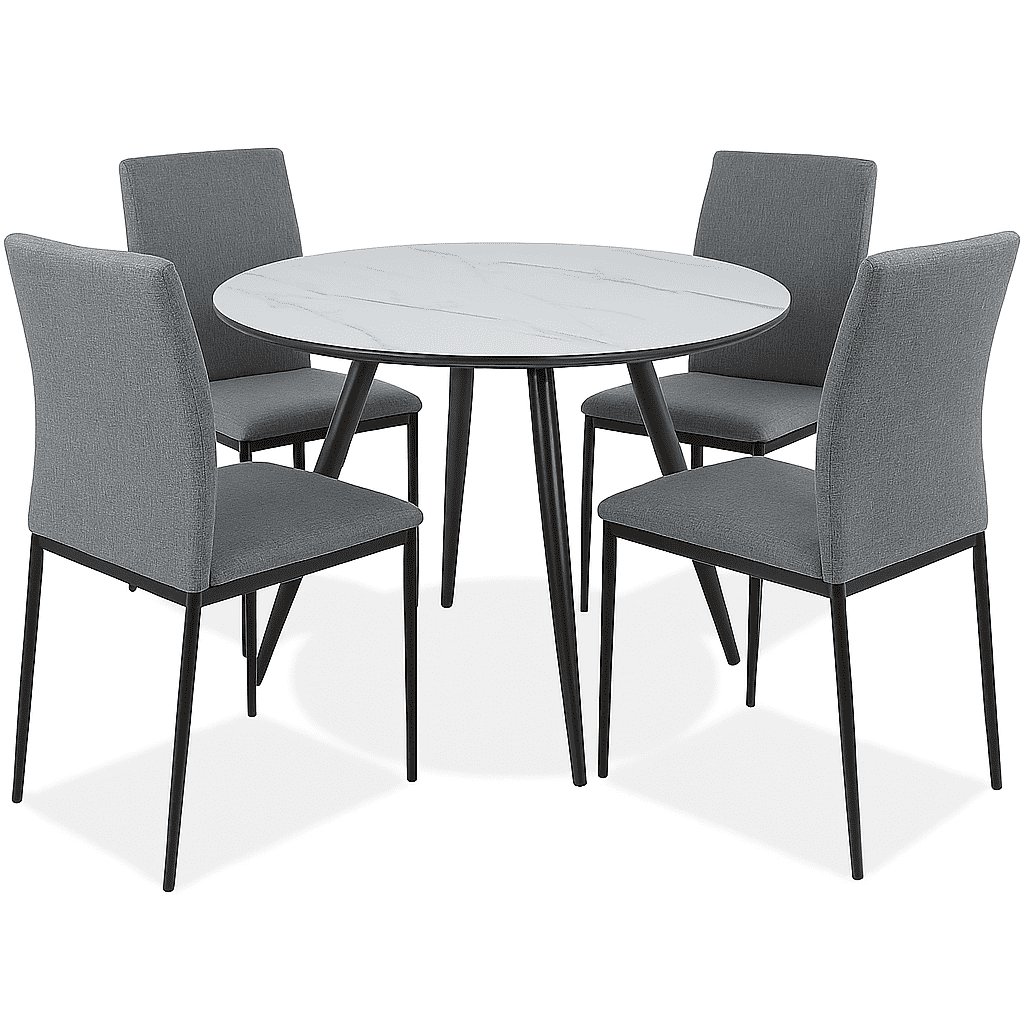 Elegáns és praktikus étkezőgarnitúrát keres otthonába? A TRAVIS alap étkezőgarnitúra kerek étkezőasztallal és négy kárpitozott székkel ideális megoldás kisebb és nagyobb terekbe egyaránt. A márványutánzatú kerek asztal kifinomult megjelenést kölcsönöz a térnek, míg a stabil fekete fém lábak garantálják a szilárdságot és a tartósságot. A semleges szürke kárpitozással és karcsú fémvázzal ellátott székek kényelmes ülést és modern dizájnt kínálnak. A TRAVIS étkezőgarnitúra 4 fő befogadására alkalmas, kisebb konyhákba is alkalmas.