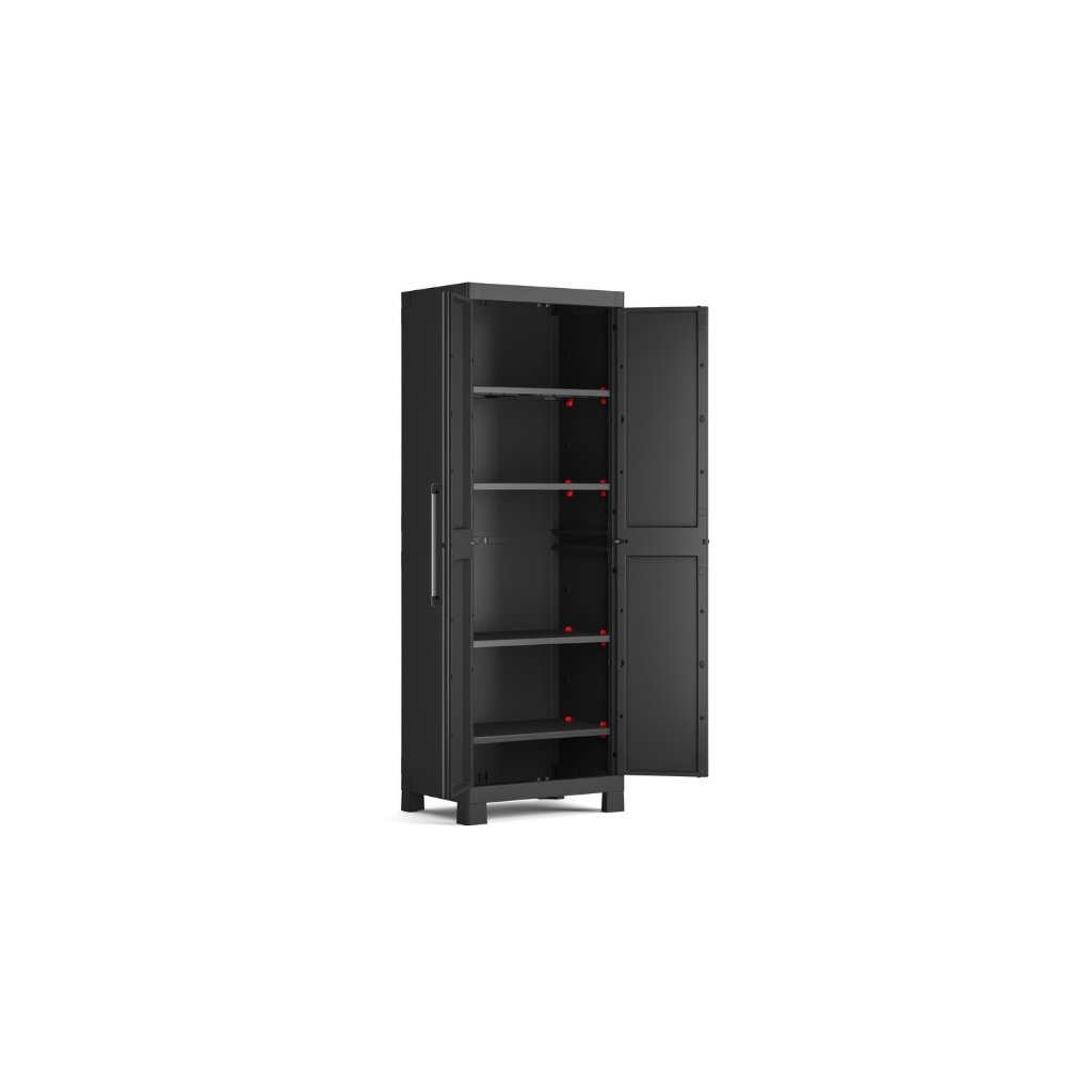 A szekrény kiváló minőségű és tartós műanyagból készült, amely erős, stabil és mindennapi használatra alkalmas. Az anyag ellenáll a nedvességnek és a gyakori kültéri körülményeknek, így a szekrény alkalmas műhelyekbe, garázsokba és fedett kültéri területekre. A polcok teherbírása polconként akár 15 kg is lehet, ami lehetővé teszi különféle tárgyak és szerszámok biztonságos tárolását.