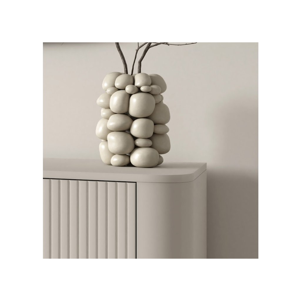 Az ARTZEN kasmír színű TV-állvány elegáns dizájnjával nyűgöz le, amely a finoman lekerekített szettakat a jellegzetes, barázdált, léces előlapokkal ötvözi. A praktikumot a fogantyú nélküli , nyomásra nyíló nyitórendszer biztosítja, amelynek köszönhetően a bútor letisztult és elegáns megjelenésű. A TV-állvány kétféleképpen is felszerelhető: dizájner lábakra vagy falra akasztható, ami légies hatást kelt. A TV-állvány időtlen darab, amely modern és minimalista enteriőrökbe egyaránt illik, és stílusos jelleget kölcsönöz a térnek.