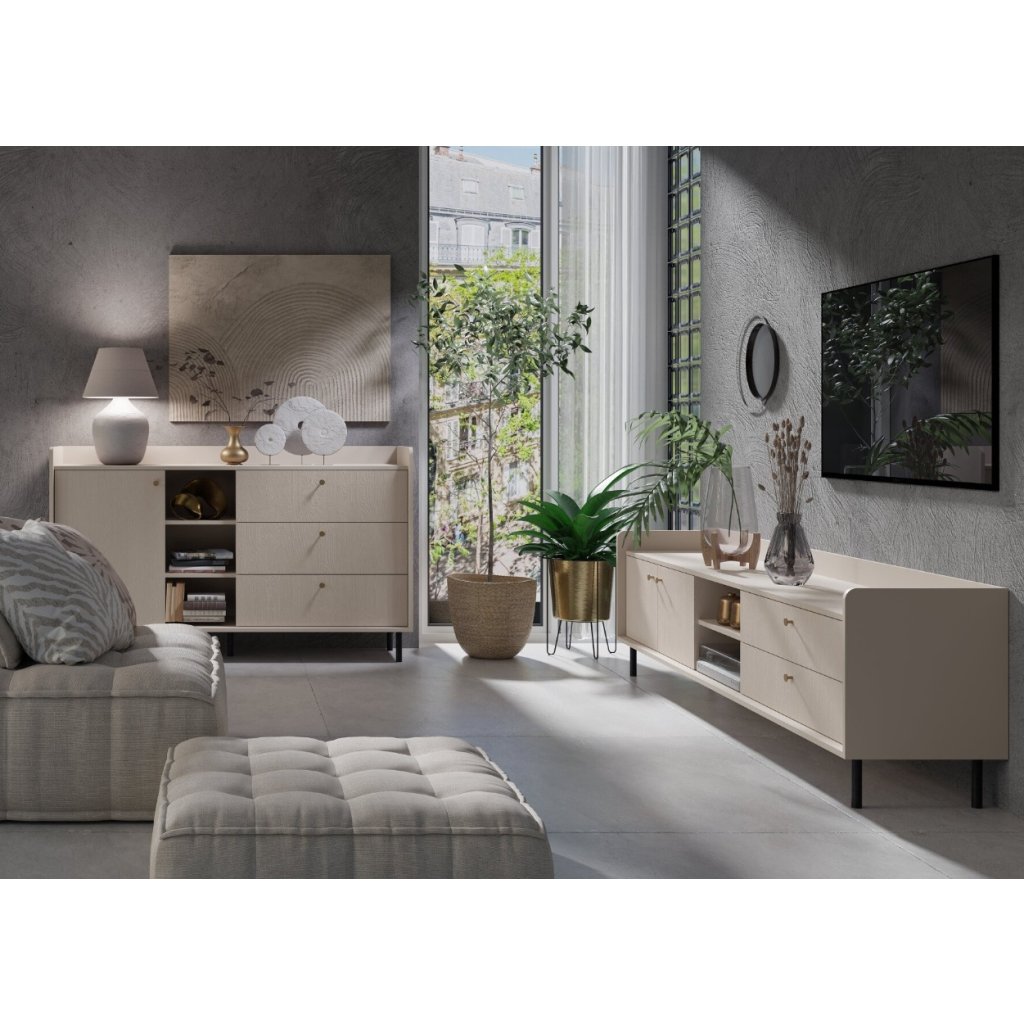 Tegye otthonossá nappaliját a GRANDE kollekció bútoraival , amelyek harmónia és kényelem hangulatát viszik a térbe. A megemelt és finoman lekerekített élek nemcsak megakadályozzák, hogy a tárgyak leessenek a felső felületről, hanem eredeti és elegáns megjelenést is kölcsönöznek a bútornak . A GRANDE GR8 TV-asztal ennek a kollekciónak a része, amely a stílusos dizájnt számos praktikus megoldással ötvözi. A TV-asztal tágas, fiókokkal és arany színű fogantyúkkal ellátott szekrénnyel rendelkezik.