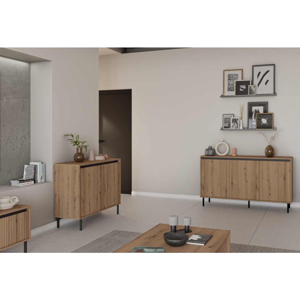 A KASOA 2S/312 | tölgyfa TV-állvány minimalista formájával tűnik ki, gazdagítva a... precízen megmunkált részletek , amelyek a japán esztétika egy teljesen új dimenzióját hozzák a belső térbe. A színpaletta lágy, földszínű tónusokra van hangolva , mint például a tölgyfa, kiegészítve fekete díszítésekkel, amelyek... Elegánsan kontrasztos a világos árnyalatokkal. Az egyszerű fekete fém lábak könnyedséget és vizuális légiességet kölcsönöznek a bútornak anélkül, hogy nehézkesnek tűnne. A TV-állvány két tágas fiókkal és egy nyitott polccal rendelkezik. Az asztalon praktikus kábelvezető nyílás is található.